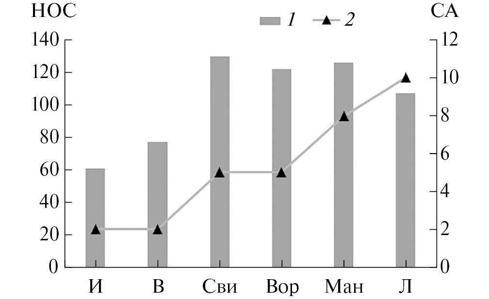 Рис. 2. Изменение общего числа НОС (1) и числа карбоновых кислот (CA, 2) в составе НМ P. perfoliatus в исследованных биотопах. И – зал. Импилахти, В – у устья р. Волхов, Сви – Свирская губа, Вор – у пос. Вороново, Ман – о. Мантинсаари, Л – зал. Лехмолахти.