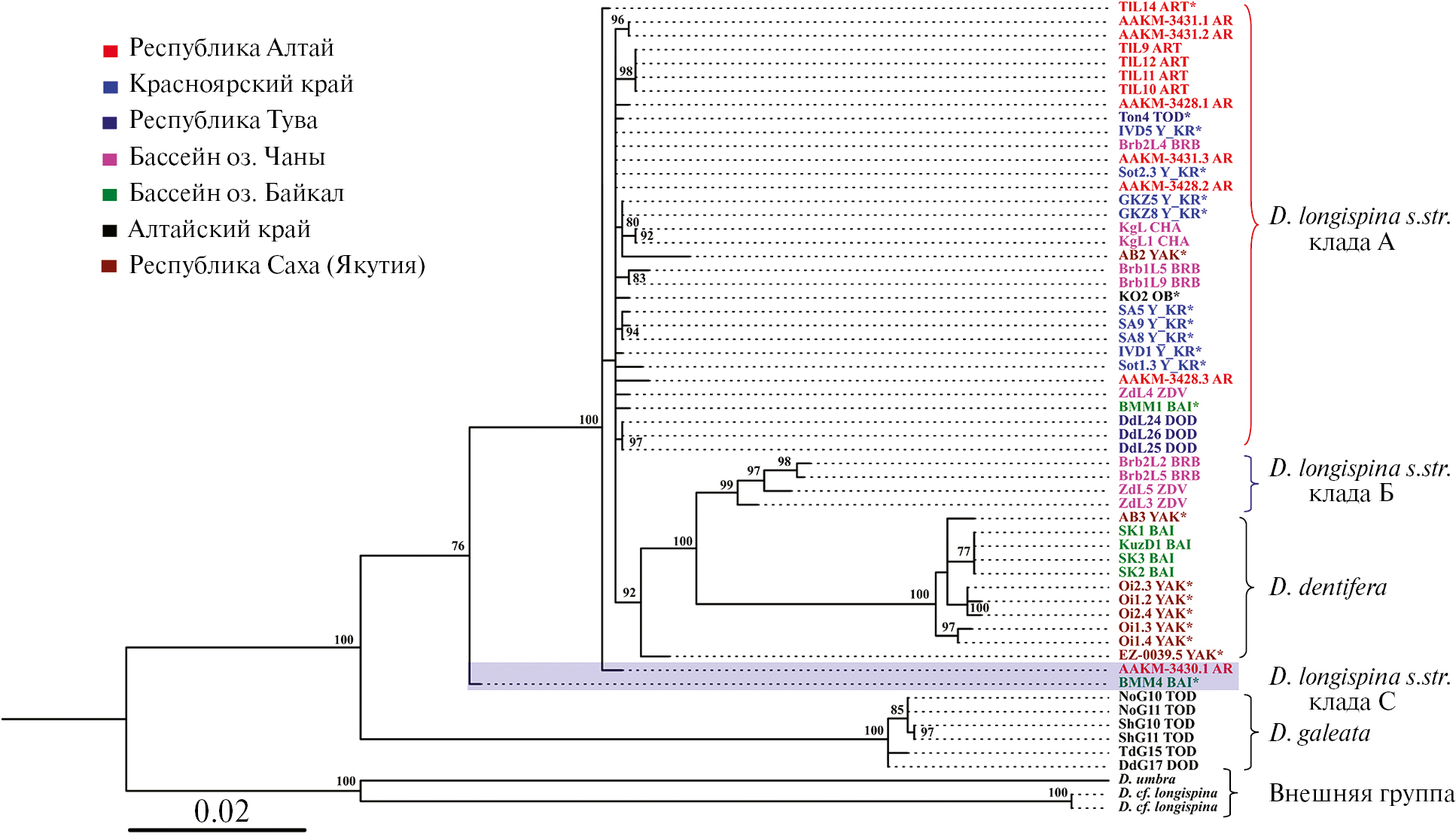 Филогения и филогеография. В пределах D. longispina s.str. достоверно выделяются глубокие дивергентные линии с высокой бутстрэп поддержкой, что связано с явно выраженной пространственной структурированностью популяций. Очевидно, такая структурированность сильно влияет на уровень полиморфизма в пределах вида (показатели Hd, k, Ka/Ks). Помимо гаплотипов, формирующих “сибирскую” и “европейскую” (“A” и “Б”) группы, в Якутии и в оз. Байкал обнаружены дистантные гаплотипы, образующие еще одну особую линию, которую ранее не отмечали в Сибири. Одна часть этих гаплотипов тесно связана с гаплотипами из бассейна р. Печоры (Petrusek et al., 2012), другая часть формирует отдельную ветвь на дереве, маркируемой нуклеотидными заменами по фрагменту гена 12S. Добавление в анализ новых образцов D. longispina s.str. привело к выявлению дивергентных митохондриальных субклад в пределах “сибирской” клады, которая ранее представлялась однородной (Zuykova et al., 2018b; 2019; 2021). Гаплотипы, формирующие дивергентные субклады, обнаружены преимущественно в популяциях, населяющих либо бессточные временные водоемы (Красноярский край, Новосибирская обл.), либо горные озера (Горный Алтай).