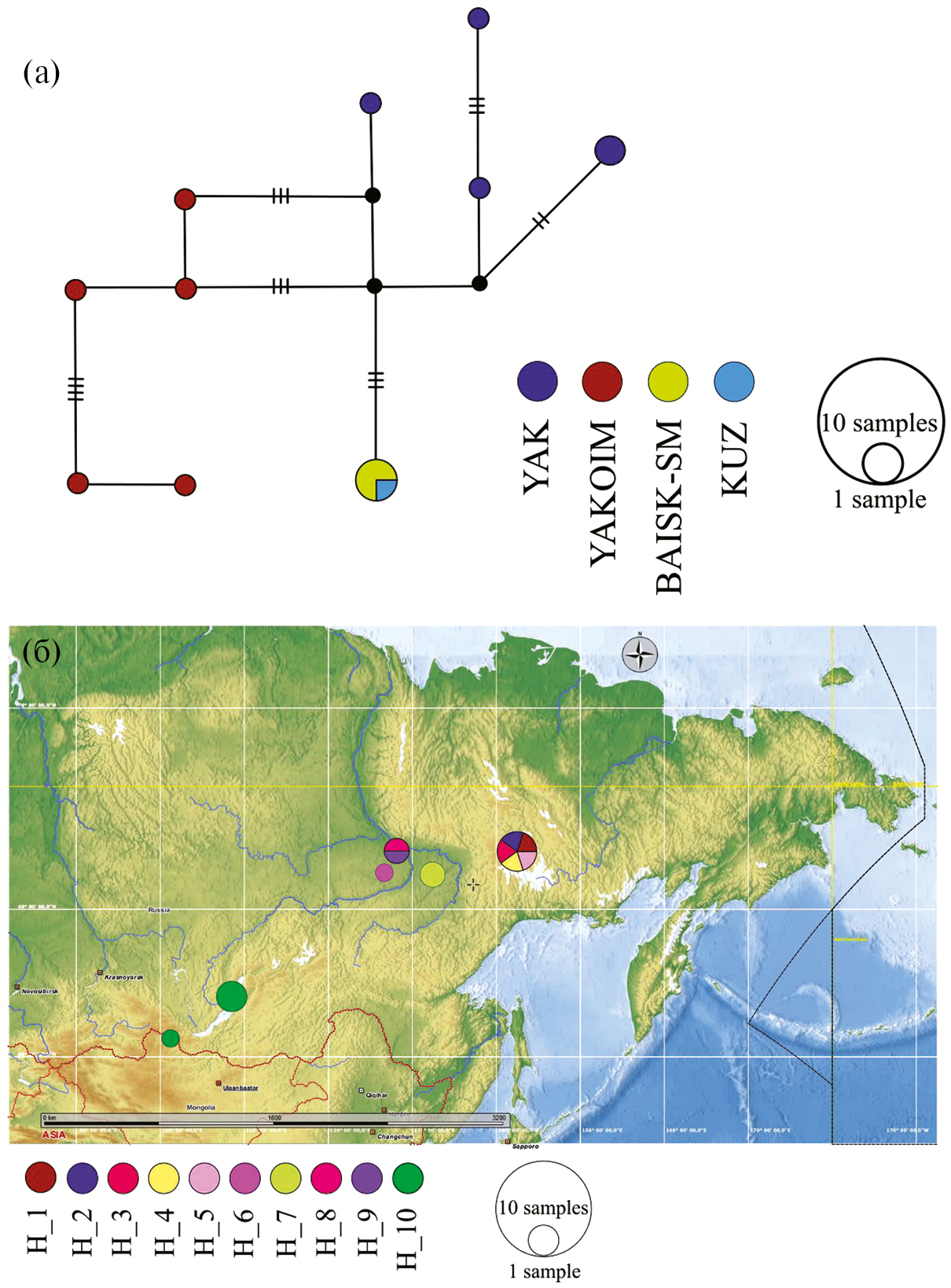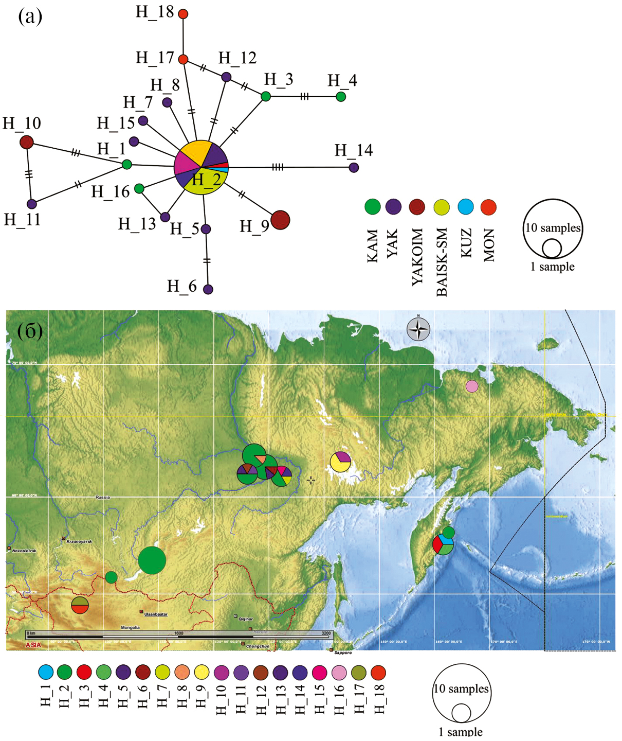 Географическое распределение и сети гаплотипов D. longispina s.str. Все гаплотипы по локусу 12S для D. longispina s.str. группируются в две крупные митохондриальные клады: “сибирскую” “А” и “европейскую” “Б”. Клады связаны через семь мутаций и два гипотетических гаплотипа (рис. 4а). К последним наиболее близки гаплотипы H_7 (горные озера Республики Алтай), H_42 (Ямало-Ненецкий автономный округ) клады “A” и H_38 (бассейн оз. Чаны) клады “Б”. Между кладами расположены гаплотипы из оз. Око Земли (бассейн оз. Байкал), формирующие специфическую митохондриальную группу гаплотипов. Отметим, что 12S гаплотипы “сибирской” клады D. longispina s.str. преимущественно встречаются в водоемах, расположенных восточнее оз. Чаны (бассейн р. Оби) и формируют звездообразную структуру с центральным гаплотипом H_1 (рис. 4a). Этот гаплотип встречается в большинстве популяций, обитающих на территории Северной Евразии – от Ямало-Ненецкого автономного округа до Якутии, однако не зарегистрирован в популяциях из Монголии, Тувы, озер Телецкоe и Додот (рис. 4б). Высокое число уникальных 12S гаплотипов D. longispina s.str. выявлено в бессточных водоемах центральной части Красноярского края (рис. 4б, H_14-H_21). Уникальные гаплотипы обнаружены почти во всех популяциях и связаны с центральным гаплотипом через одну–две, или через три–четыре мутации.