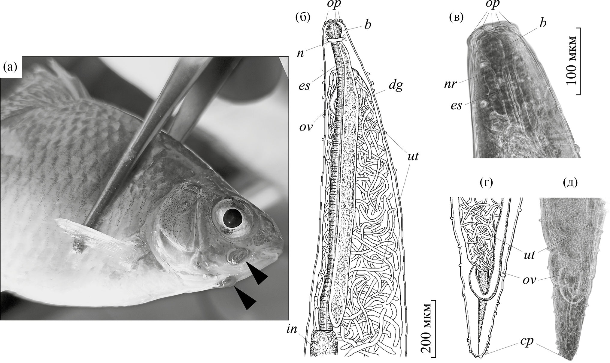 Рис. 1. Обыкновенный горчак, зараженный P. strelkovi, локализация нематоды отмечена черными стрелками (a), передняя часть тела самки (б), фотография переднего конца тела самки (в), задний конец тела самки (г); фотография заднего конца тела самки (д): b – бульбус, cp – клоакальные сосочки, dg – дорсальная железа, es – пищевод, in – кишечник, n – нервное кольцо, op – ротовые сосочки, ov – яичник, ut – матка.