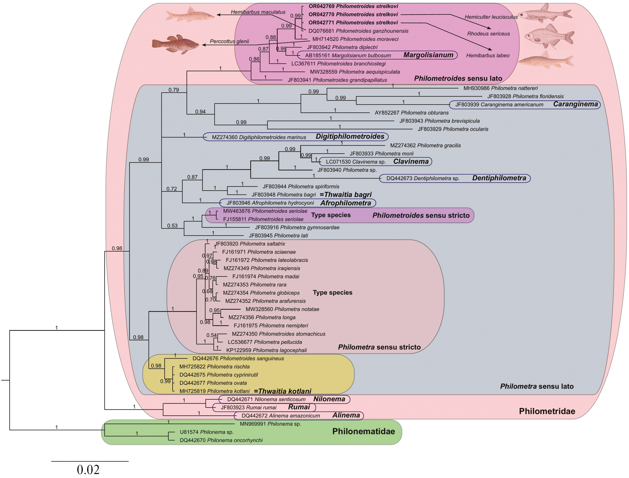 За последние несколько лет опубликованы работы, расширяющие представления о разнообразии представителей сем. Philometridae. Их значительная часть, связанная с генетической характеристикой, филогенетическими реконструкциями и систематикой, проведена европейскими коллегами для филометрид из карповых Австралии, Южной и Северной Америки, Европы (Negreiros et al., 2019; Moravec et al., 2021; Barton et al., 2022; Montes et al., 2022). Для Дальневосточного региона известно несколько работ из России, Кореи и Китая (Yu, 1998; Wu et al., 2005; Seo et al., 2015; Wang et al., 2015; Sokolov et al., 2020) с описанием новых видов или генетической характеристикой уже известных. В частности, одна из них посвящена описанию нового вида Philometroides ganzhounensis, для которого позже были получены генетические данные (Wu et al., 2005). Недавно P. ganzhounensis и еще один вид из Китая P. buirnurensis Luo, Chen, Fang, Wang, 2004 из-за идентичной морфологии были сведены в синонимы с P. pseudaspii Moravec et Ergens, 1970 (Moravec, 2023). Philometroides pseudaspii на древе, опубликованном китайскими коллегами (Wu et al., 2005), не был представлен.