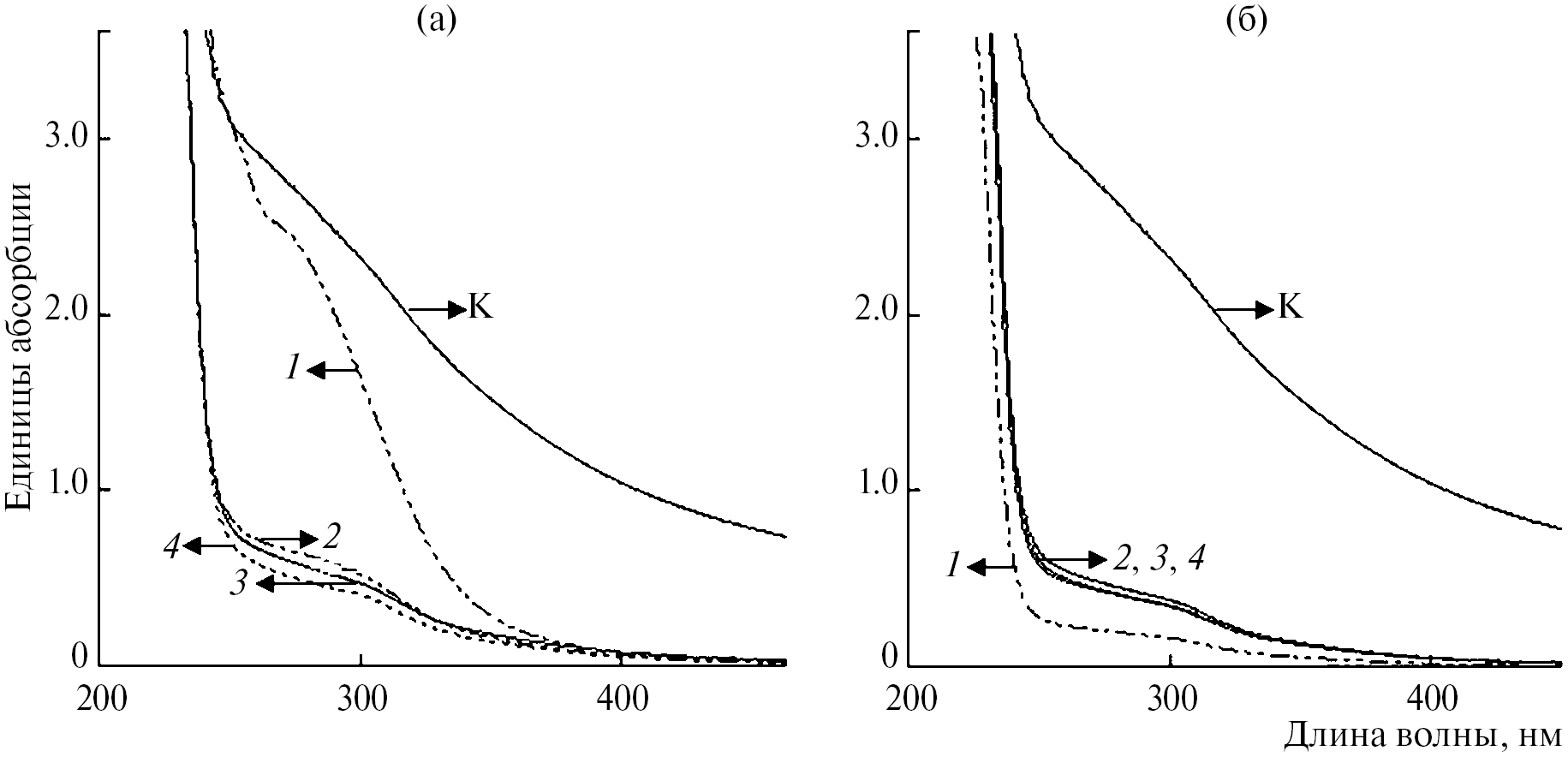 Рис. 2. Спектральная характеристика изменения состава гуминовых веществ при разном диапазоне оттаивания: а – –18°С…+4°С, б – –18°С…+23°С; на оси ординат – единицы абсорбции, на оси абсцисс – длина волны; К – контроль; штаммы: 1 – 17ВП, 2 – 13НП, 3 – 45ВД, 4 – 40НД.