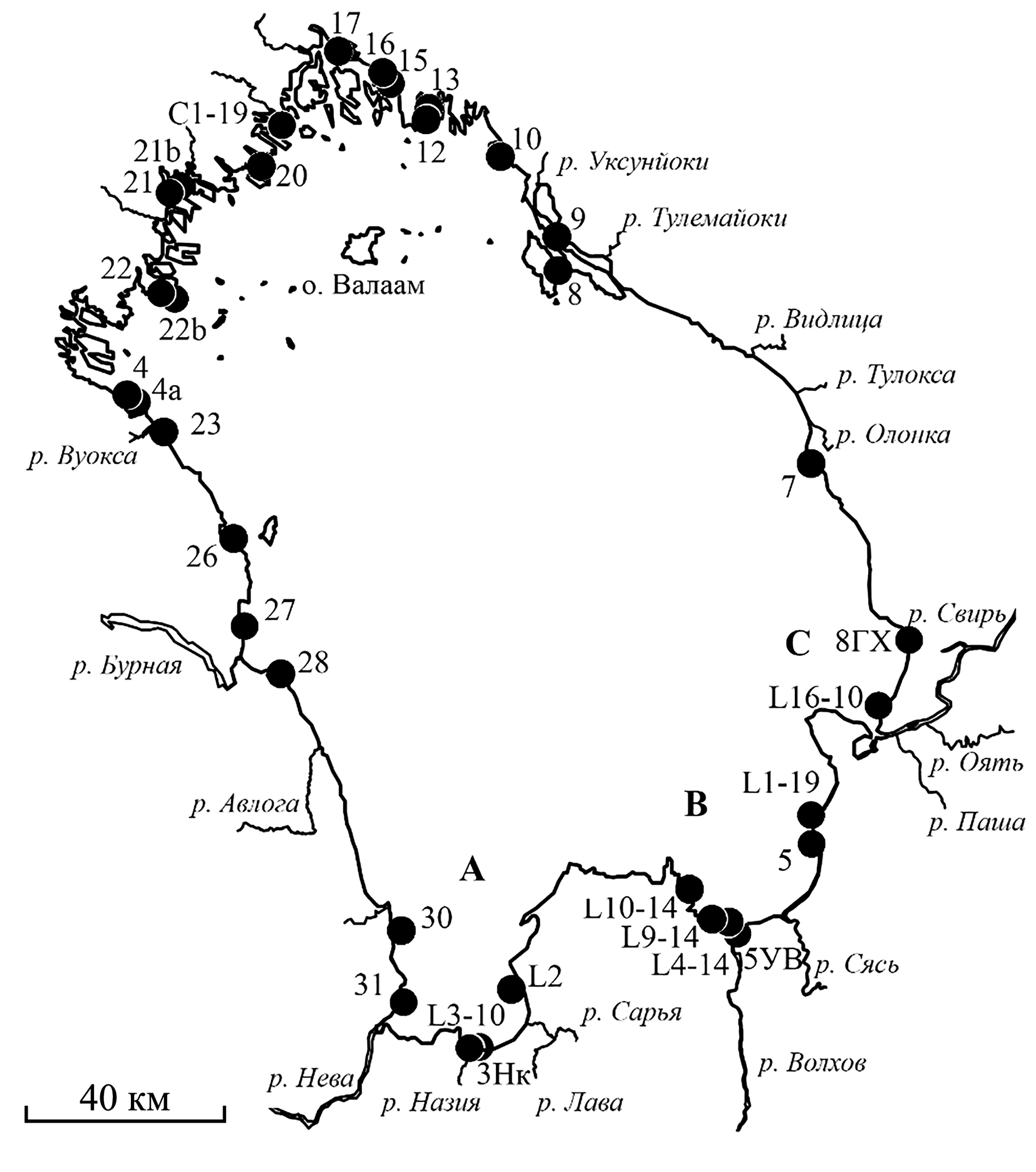 Рис. 1. Схема расположения станций в литоральной зоне озера. Южные заливы озера: А – Бухта Петрокрепость, В – Волховская губа, С – Свирская губа. Черными кружками обозначены станции.