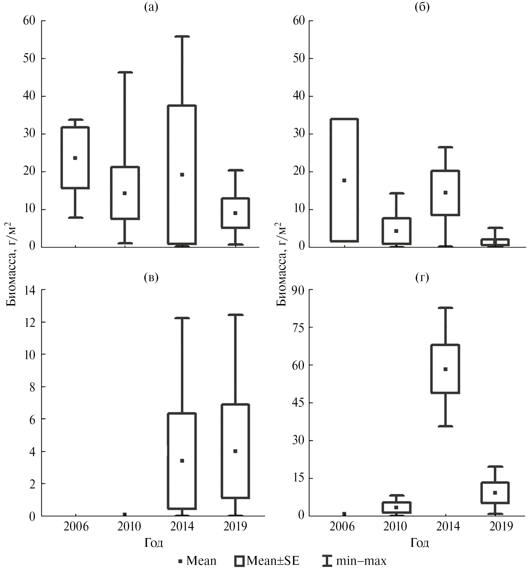 Рис 4. Динамика изменений биомассы инвазивных амфипод в заливах южного района литоральной зоны Ладожского озера в разные годы: а – Gmelinoides fasciatus, б – Gmelinoides fasciatus, в – Chelicorophium curvispinum, г – Pontogammarus robustoides; a – бухта Петрокрепость, б–г – Волховская губа.