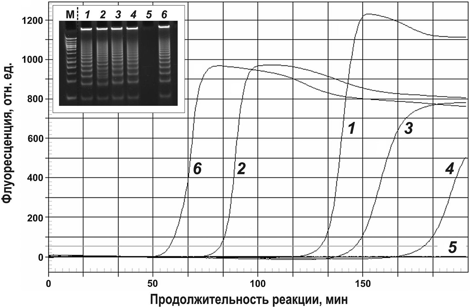 Амплификационные эксперименты проводили следующим образом. Образцы для амплификации готовили в ПЦР-боксе UVC/TM-AR («Biosan», Латвия), предварительно облучая рабочее пространство, дозаторы и пластиковую посуду ультрафиолетом в течение 20 мин. Реакцию ММ проводили в приборе iQ5 («Bio-Rad Laboratories», США). Образцы объёмом 10 мкл содержали 107 копий ДНК-матрицы, 5 пмоль каждого праймера, 1 мкл смеси дНТФ с концентрацией 2,5 мМ каждого, 3,0 ед. акт. ДНК-полимеразы Bst LF, 1× буфер ДНК-полимеразы, 0,1× dsGreen. Программа амплификации состояла из следующих этапов: 1) 70 °С – 30 с, 2) 65 °С – 60 с, 3) 60 °С – 3 ч. Каждый образец был представлен в трёх повторах. Результаты ММ анализировали дополнительно с помощью электрофореза в 10%-ном полиакриламидном геле с окрашиванием бромистым этидием и визуализацией в системе GelDoc XR («Bio-Rad Laboratories»).