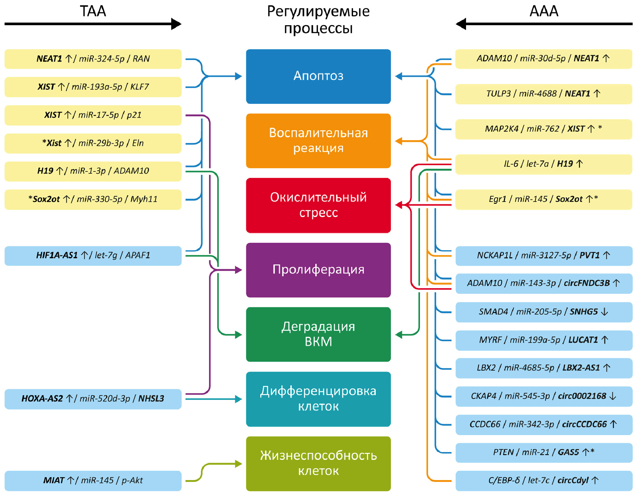 Наряду с результатами биоинформатического анализа на основании данных транскриптомных исследований, о потенциальной значимости отдельных lncRNA и circRNA в патогенезе АА могут свидетельствовать данные об их вовлечённости в функционирование ключевых клеточных участников патогенеза при развитии данной патологии. Например, установлено, что lncRNA ANRIL (известна также как CDKN2B-AS1) регулирует экспрессию генов, функционально связанных с ГМКС, SENCRингибирует их миграцию, LncAng362 (в настоящее время известна как MIR222HG) регулирует пролиферацию, HIF1A-AS1 оказывает проапоптический и антипролиферативный эффект на данные клетки (цит. по Duggirala et al. [49]). В дальнейшемзначимость данных lncRNA в развитии АА получила подтверждение в других исследованиях. Так, установлено повышение уровня HIF1A-AS1 в сыворотке пациентов с ТАА [70], в тканях аорты при ТАА [71] и при TAAA [65]. Подтверждено участие данной lncRNA в регуляции пролиферации, апоптоза и активности белков внеклеточного матрикса в ГМКС [65, 71, 72]. В частности, in vitro показано, что подавление HIF1a-AS1 влияет на уровень апоптотических белков (приводит к снижению уровня экспрессии каспазы 3 и каспазы 8 и к повышению экспрессии Bcl2), защищает от апоптоза и стимулирует пролиферацию ГМКС, что указывает на участие данной lncRNA в патогенез ТААА [65].