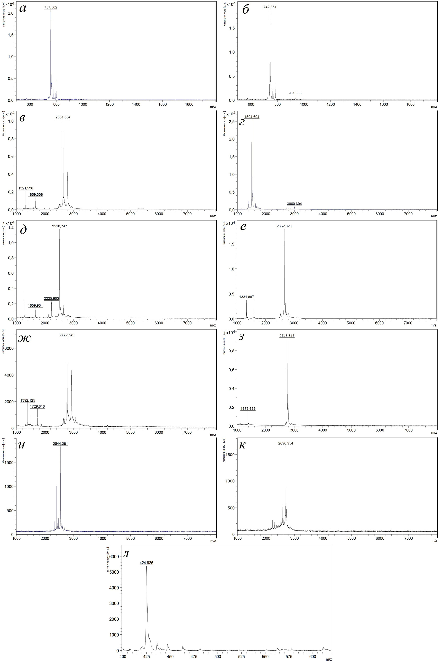 Рис. 1. Масс-спектры (MALDI-TOF) синтезированных пептидов: а – AB-9, б – AB-10, в – AB-11, г – AB-12, д – AB-13, е – AB-14, ж – AB-15, з – ST-10, и – AB-32, к – AB-33, л – AST-1