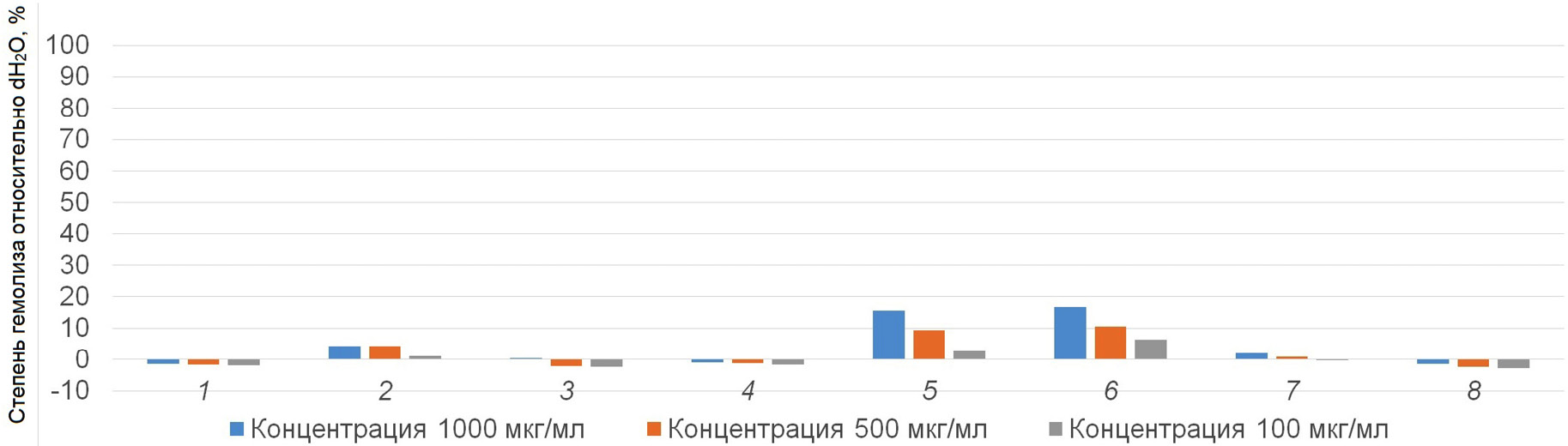 Рис. 3. Гемолитическая активность пептидов, % от гемолиза эритроцитов в дистиллированной воде: 1 – AB-10, 2 – AB-11, 3 – AB-12, 4 – AB-13, 5 – AB-14, 6 – AB-15, 7 – ST-10, 8 – AST-1