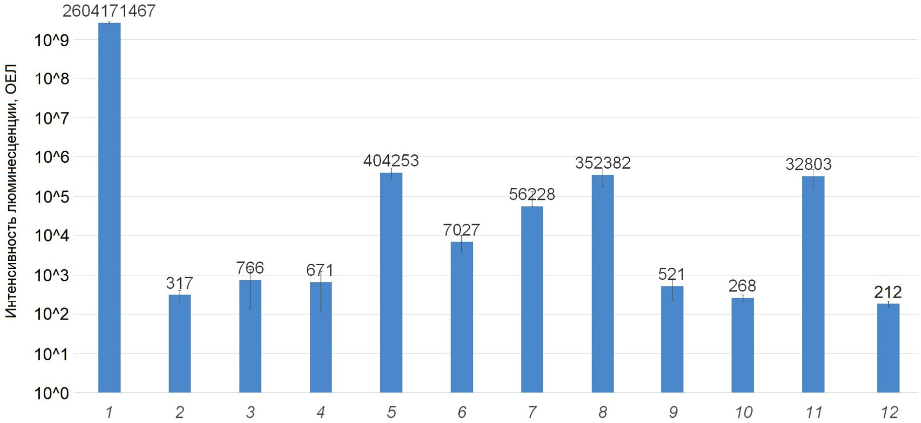 Рис. 5. Сравнительная активность пептидов в стимуляции трансфекции плазмиды pGL3, кодирующей репортерный ген люциферазы, выраженная как средние значения ± SE. 1 – Lipofectamine 3000, 2 – AB-10, 3 – AB-11, 4 – AB-12, 5 – AB-13, 6 – AB-14, 7 – AB-15, 8 – AB-32, 9 – AB-33, 10 – AST-1, 11 – ST-10, 12 – ФСБ (отрицательный контроль)