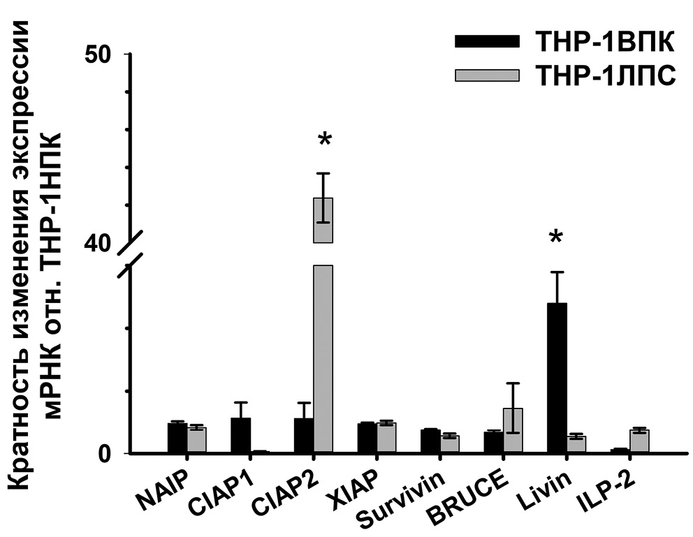 Рис. 4. Уровень экспрессии мРНК генов белков семейства IAPs (BIRC) в клетках THP-1ВПК и THP-1ЛПС в сравнении с клетками THP-1НПК. Данные приведены в виде среднего значения ± SD (n ≥ 5). * р < 0,05 в сравнении c клетками THP-1 в НПК