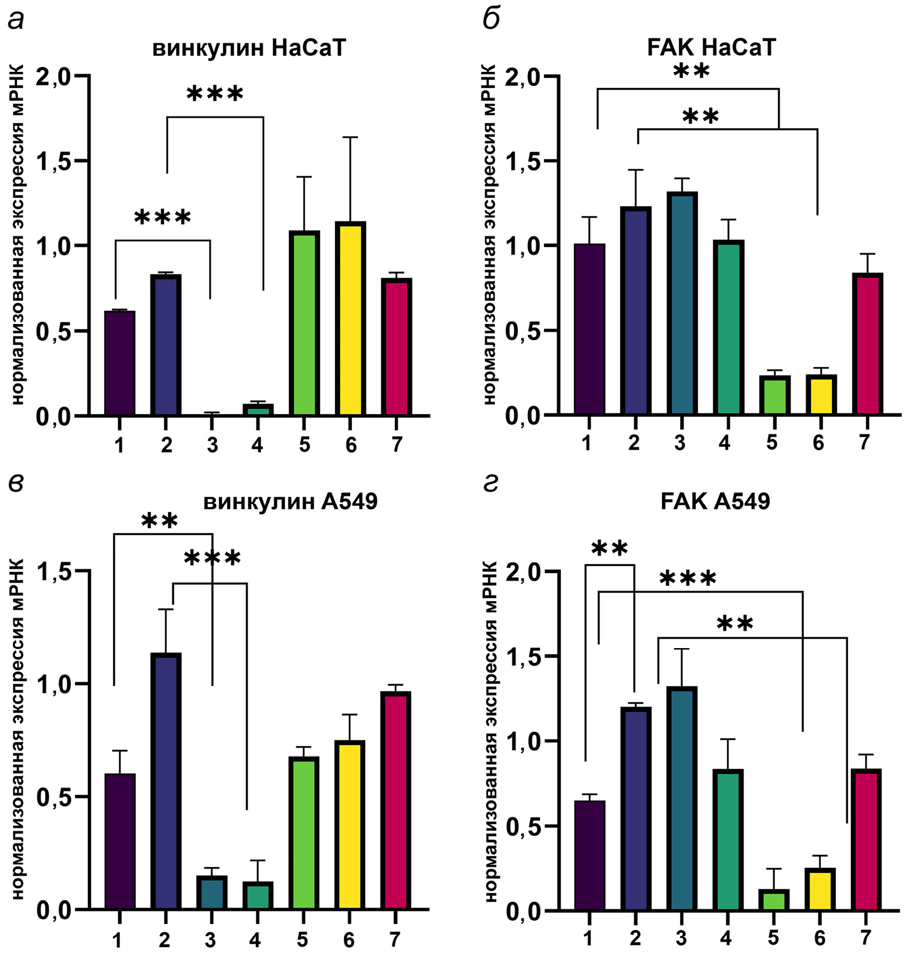 Рис. 2. Нормализованная экспрессия мРНК винкулина (а, в) и FAK (б, д) в клетках A549 и HaCaT в контроле и после подавления в клетках экспрессии мРНК винкулина или FAK. Все измерения проводили в трипликате, данные нормализовали по генам UBC и HPRT1. Обозначения: (1) контрольные клетки на стекле, (2) контрольные клетки на фибронектине, (3) клетки с миРНК к винкулину на стекле, (4) клетки с миРНК к винкулину на фибронектине, (5) клетки с миРНК к FAK на стекле, (6) клетки с миРНК к FAK на фибронектине, (7) клетки с миРНК к GFP. ** Достоверное отличие от контроля, р < 0,01;*** достоверное отличие от контроля, р < 0,001