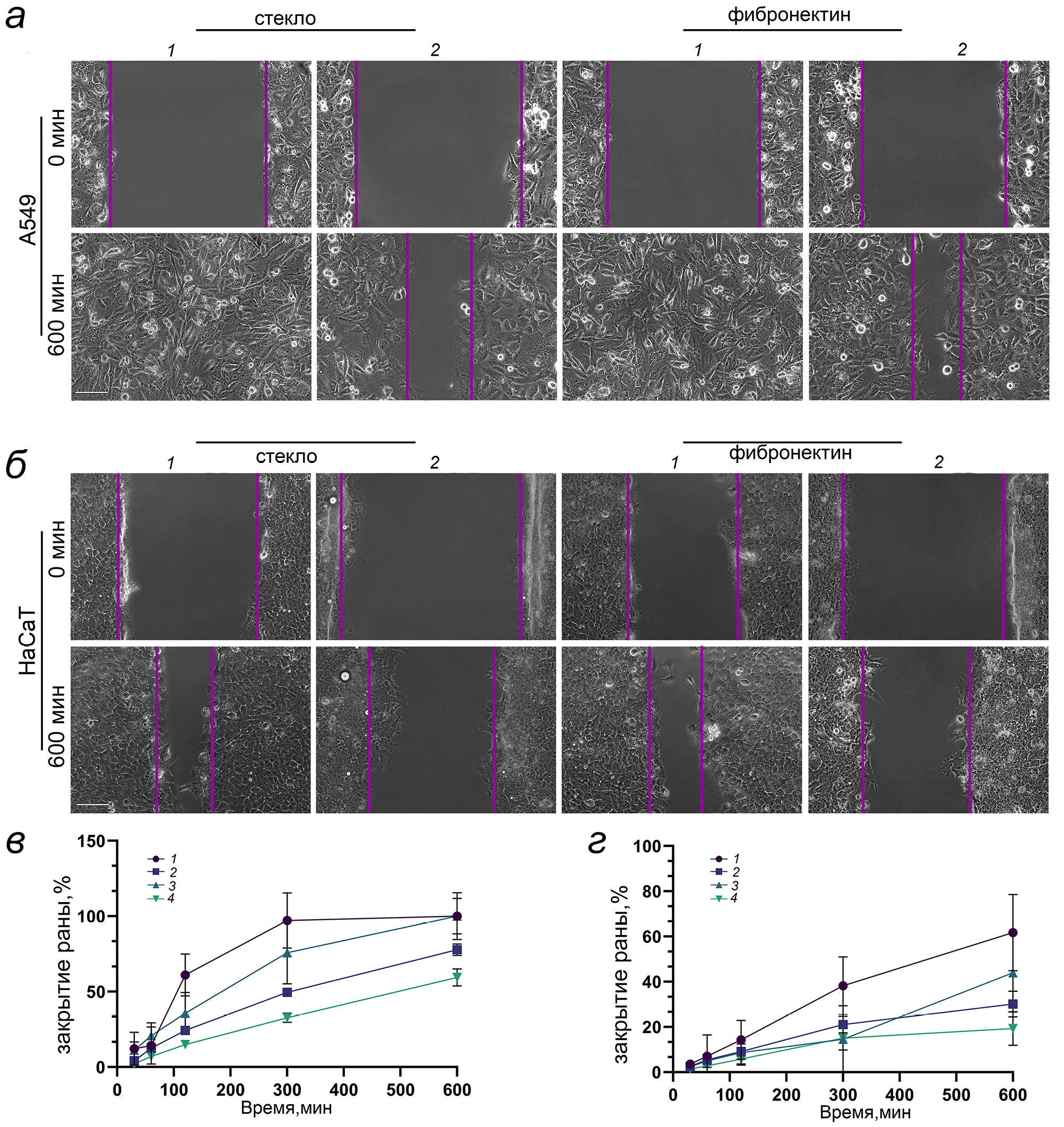 Рис. 5. Зарастание экспериментальной раны на фибронектине и стекле. а – Зарастание экспериментальной раны клетками A549 на фибронектине и на стекле в контроле (1) и после инкубации с 1 мкМ PF-573228 (2). б – Зарастание модельной раны клетками HaCaT на фибронектине и на стекле в контроле (1) и после инкубации с 1 мкМ PF-573228 (2). в – Степень зарастания экспериментальной раны в % от площади на первом кадре съёмки для клеток A549 на фибронектине в контроле (1), на фибронектине в клетках после инкубации с 1 мкМ PF-573228 (2), на стекле в контроле (3) и на стекле в клетках после инкубации с 1 мкМ PF-573228 (4). г – Степень зарастания экспериментальной раны в % от площади на первом кадре съёмки для клеток HaCaT на фибронектине в контроле (1), на фибронектине в клетках после инкубации с 1 мкМ PF-573228 (2), на стекле в контроле (3) и на стекле в клетках после инкубации с 1 мкМ PF-573228 (4)