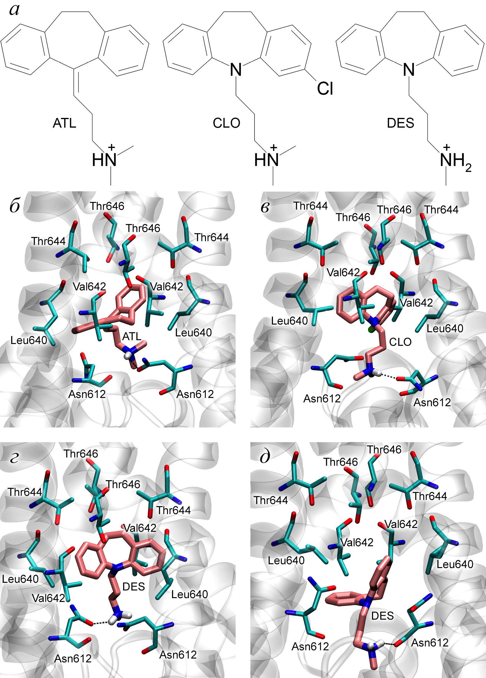 В случае ATL и CLO процедура молекулярного докинга выявила только одно возможное место связывания этих препаратов внутри NMDAR (рис. 1, б и в). В этом сайте трициклические группы препаратов связываются в окружении аминокислот Val642 и Thr646 субъединиц GluN1 и аминокислот Leu640 и Thr644 субъединиц GluN2B, а атом водорода катионной группы ATL и CLO образует водородную связь с атомом кислорода бокового радикала (Oδ1) аспарагина Asn612 одной из субъединиц GluN2B.