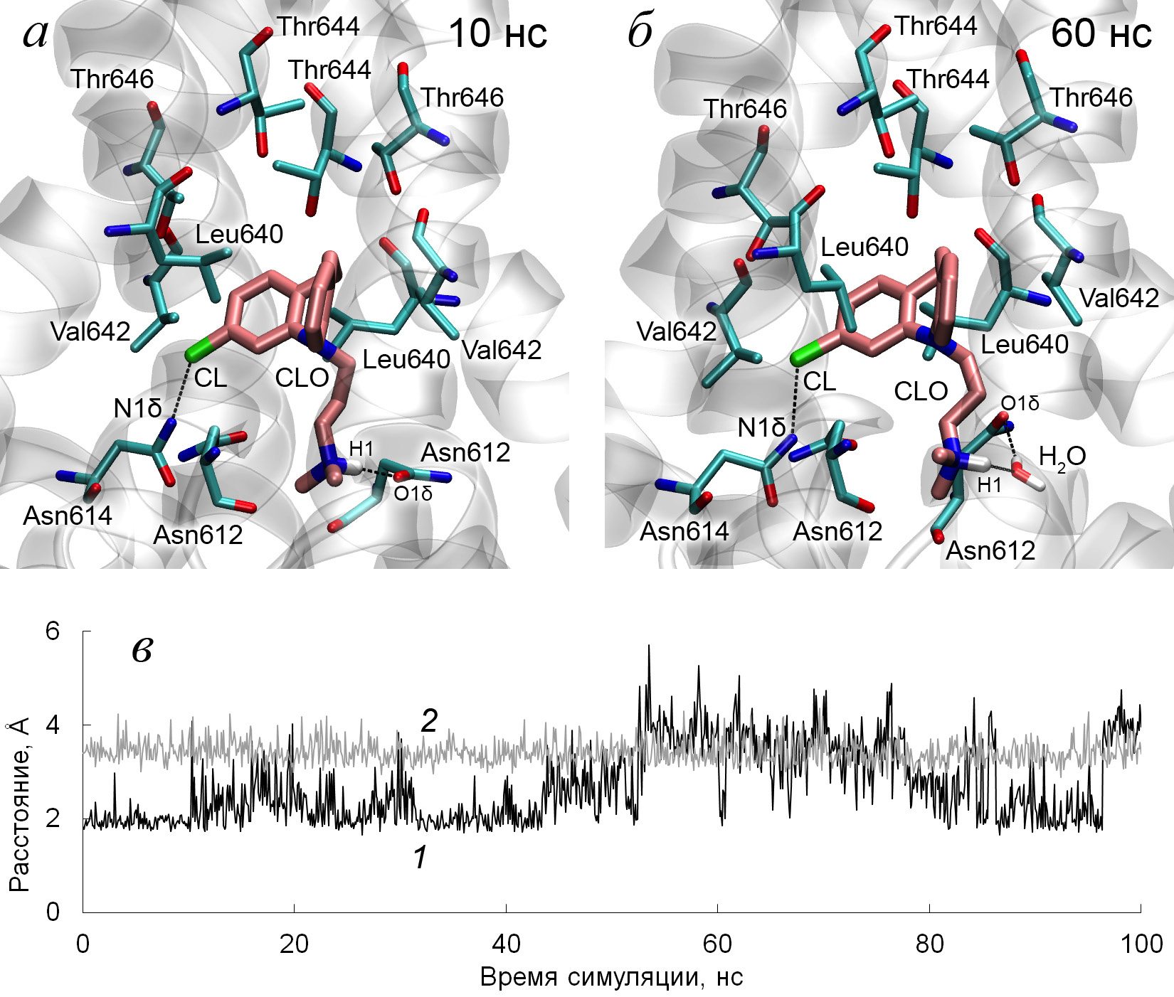 Результат конформационного анализа комплекса CLO с NMDAR представлен на рис. 3. Трициклическая группа препарата на протяжении всего периода симуляции остается связанной в окружении алифатических аминокислот Val642 и Thr646 субъединиц GluN1, а также Leu640 и Thr644 субъединиц GluN2B (рис. 3, а и б). На протяжении симуляции атом водорода H1 катионной группы CLO либо образует стабильную водородную связь с атомом кислорода O1δ бокового радикала аспарагина Asn612 одной из субъединиц GluN2B (рис. 3, а; периоды симуляции 0–50 и 80–95 нс на рис. 3, в), либо взаимодействует с Asn612 через молекулу воды (рис. 3, б; периоды симуляции 50–80 и 95–100 нс на рис. 3, в). Атом хлора на протяжении всей симуляции держится вблизи атома азота N1δ бокового радикала Asn614 одной из субъединиц GluN1 (рис. 3, а–в), среднее расстояние между этими атомами составляет 3,4 Å. По всей видимости, в данном случае между хлором и азотом образуется галогенная связь, максимальное расстояние для ее образования составляет 3,6 Å [36]. Интересно отметить, что атом азота трициклической группы не образует никаких близких контактов ни с окружающими аминокислотами, ни с молекулами воды.