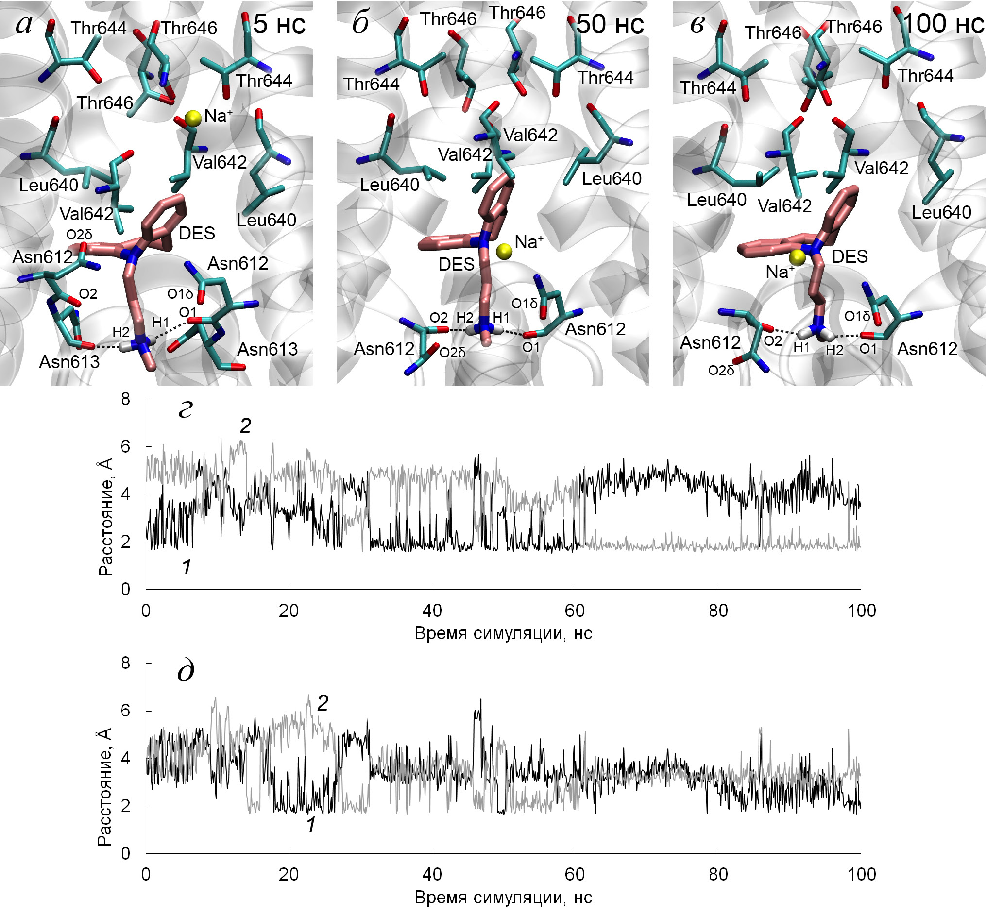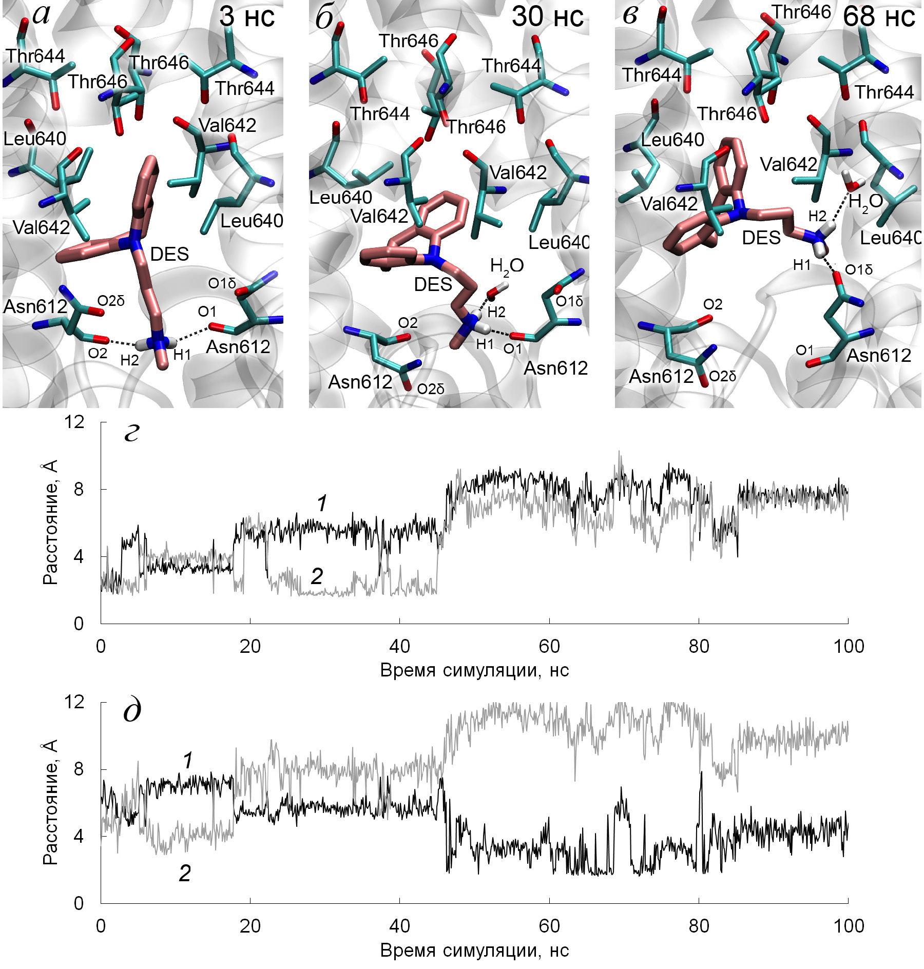 Трициклическая группа препарата на протяжении всего периода симуляции остается связанной в окружении алифатических аминокислот Val642 и Thr646 субъединиц GluN1 и Leu640 и Thr644 субъединиц GluN2B (рис. 4, а–в). В промежутках 0–10, 20–25 и 35–40 нс один из атомов водорода (H1) катионной группы DES образует стабильную водородную связь с атомом кислорода O1δ бокового радикала аспарагина Asn612 одной из субъединиц GluN2B, одновременно с этим второй атом водорода (H2) катионной группы связан с атомом кислорода O2δ бокового радикала аспарагина Asn612 второй субъединицы GluN2B (рис. 4, а и г). В остальное время оба атома водорода катионной группы DES взаимодействуют с окружающими аминокислотами через одну молекулу воды (рис. 4, б и г). И лишь после 90 нс симуляции катионная группа теряет связь с аспарагинами ионной поры и не взаимодействует с ними даже через воду (рис. 4, в и г).