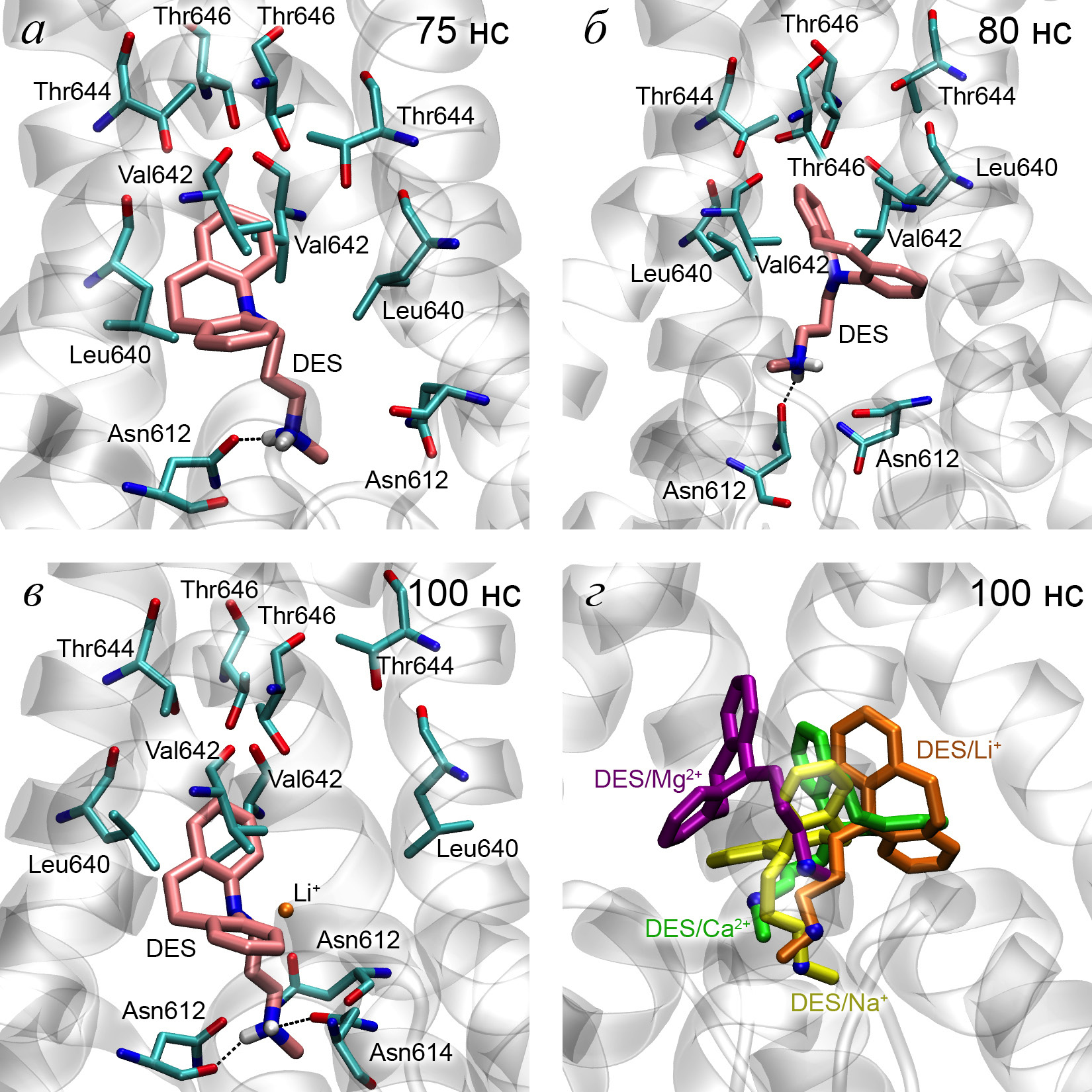 На рис. 7, г представлено выравнивание конформаций комплексов NMDAR с DES после 100 нс симуляции в присутствии различных ионов. Глубже всего молекула DES связана в ионной поре в присутствии Na+, чуть выше – в присутствии Li+, еще выше – в присутствии Ca2+, и ближе всего к внешней стороне плазматической мембраны препарат находится в присутствии Mg2+. Таким образом, однозарядные катионы (Na+, Li+) в большей степени способствуют удержанию молекулы DES в нижнем сайте, чем двухзарядные (Ca2+, Mg2+). При этом внутри каждой группы более тяжелый катион прочнее удерживает DES внутри ионной поры (натрий тяжелее лития и кальций тяжелее магния). По всей видимости, такой эффект обусловлен их гидратацией. Так, изначально катионы металлов были помещены в ионный канал без гидратной оболочки. Однако уже в процессе релаксации системы катионы Na+, Li+, Ca2+ и Mg2+ связывали молекулы воды, и к началу симуляции катион натрия был окружен двумя, катион лития – двумя, катион кальция – девятью, катион магния – семью молекулами воды. В процессе симуляции катион натрия удерживал 5–6 молекул H2O, лития – 4 молекулы, кальция – 7–8 молекул в несвязанном состоянии и 5 молекул – после связывания с концевыми аминокислотами NMDAR, магния – 7–8 молекул воды. Таким образом, из всех рассмотренных катионов магний наиболее прочно удерживает гидратную оболочку, с которой он покидает ионный канал. В некоторых структурах NMDAR, полученных экспериментально, присутствуют двухвалентные металлы. Так, структура 5UN1 [22] содержит катион магния, а структура 5H8N [38] – катион кальция. В обоих случаях катионы взаимодействуют с лиганд-связывающим доменом NMDAR, который в представленной работе был удален для ускорения моделирования. Будут ли ионы кальция и магния, связанные с LBD, оказывать эффект на взаимодействие ТЦА с NMDAR – еще предстоит выяснить в последующих вычислительных экспериментах с усложнением модели.