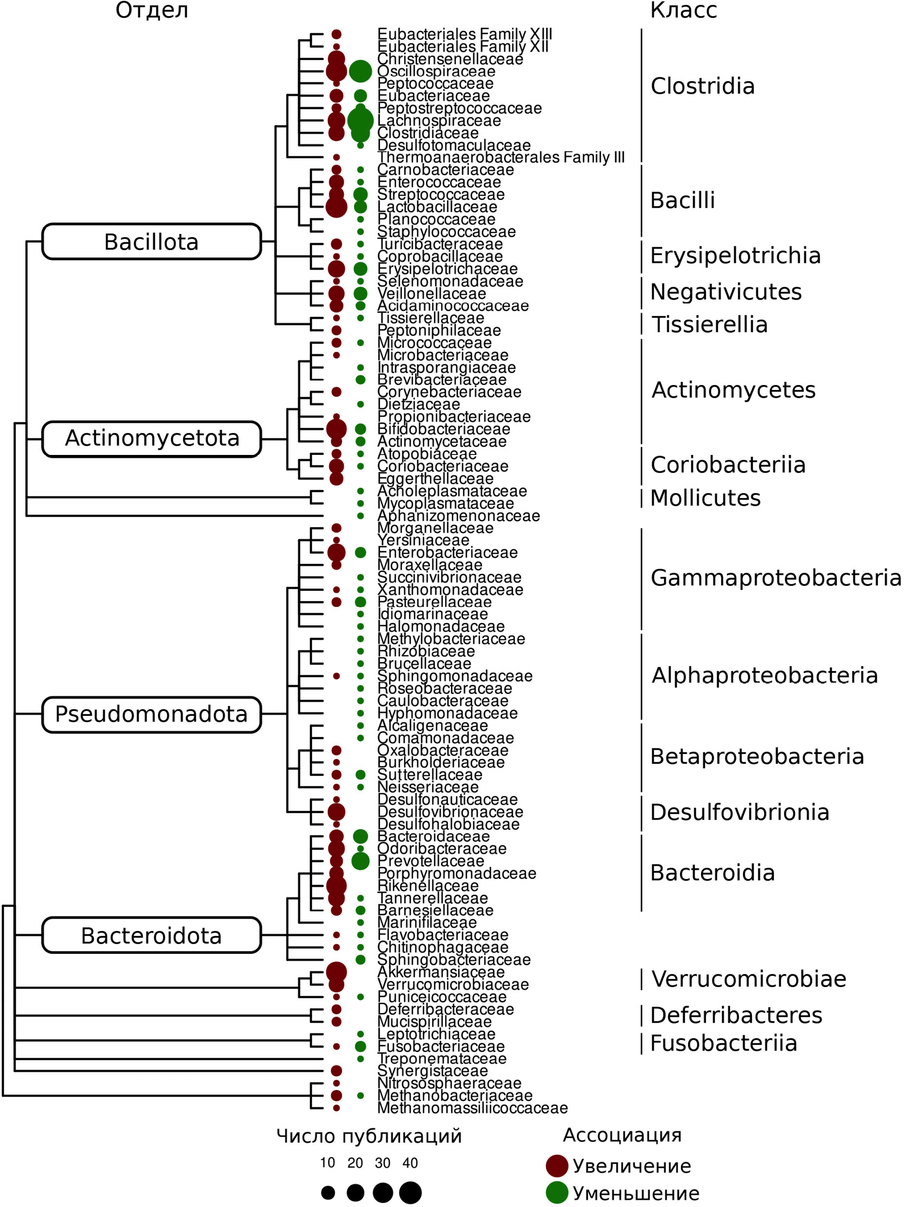Рис. 1. Известные ассоциации между изменением микробиома и развитием БП. Таксономическое дерево семейств бактерий микробиома человека (по базе данных NCBI Taxonomy) с отмеченными количествами случаев описания ассоциаций (публикаций) представителей соответствующего семейства с БП. Отдельно рассмотрены случаи, когда у больных наблюдается увеличение либо уменьшение численности конкретных групп бактерий. Поиск статей был проведен по базе данных PubMed (дата обращения – 04.12.2022; поисковый запрос был аналогичен работе Toh et al., 2022 г.: «(«Microbiota» OR «Microbiome» OR «Microflora» OR «Dysbiosis») AND («Parkinson» OR «Parkinsonism»)» [149]. В анализ были включены 138 экспериментальных статей из общего списка, включающего 1061 публикацию. Указаны классы с двумя и более выявленными семействами, а также наиболее представленные отделы бактерий