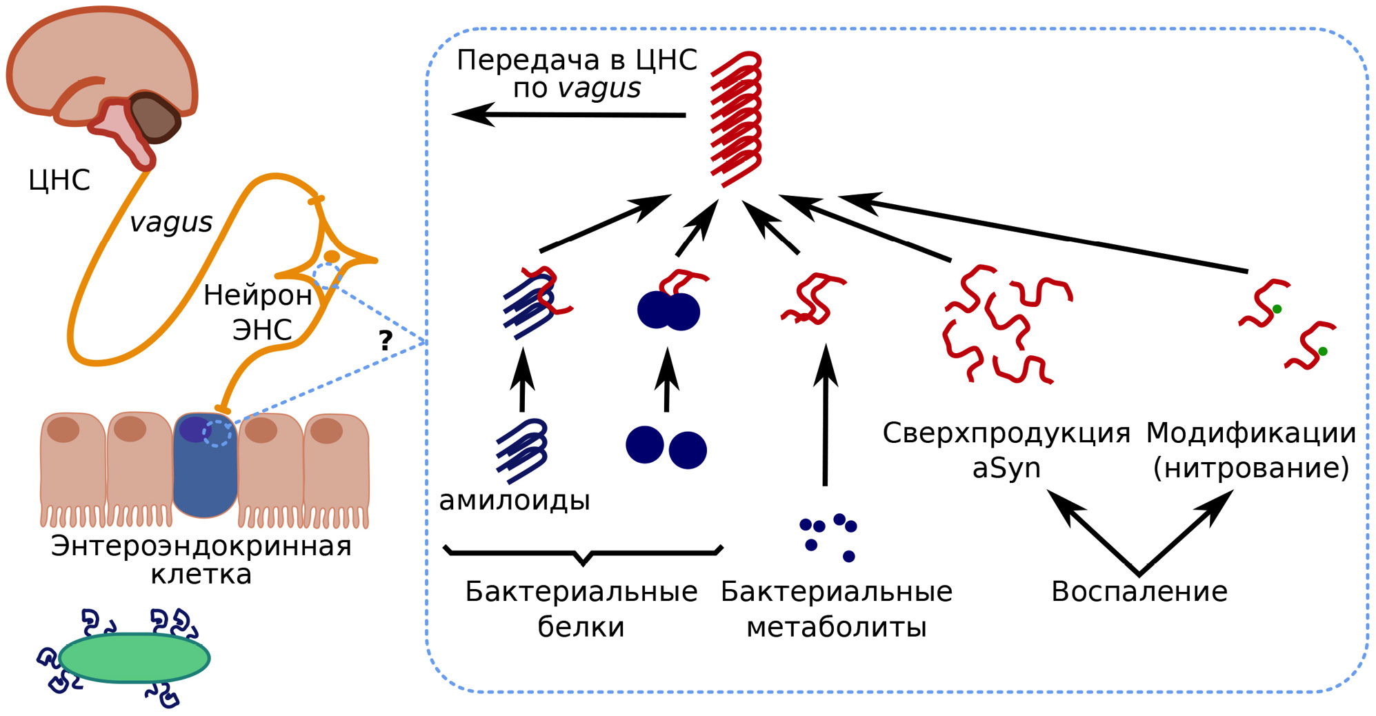 Рис. 2. Возможные механизмы агрегации aSyn в кишечнике. Знак вопроса на схеме отражает тот факт, что нет точных данных, в каких именно клетках происходят процессы, представленные в выноске