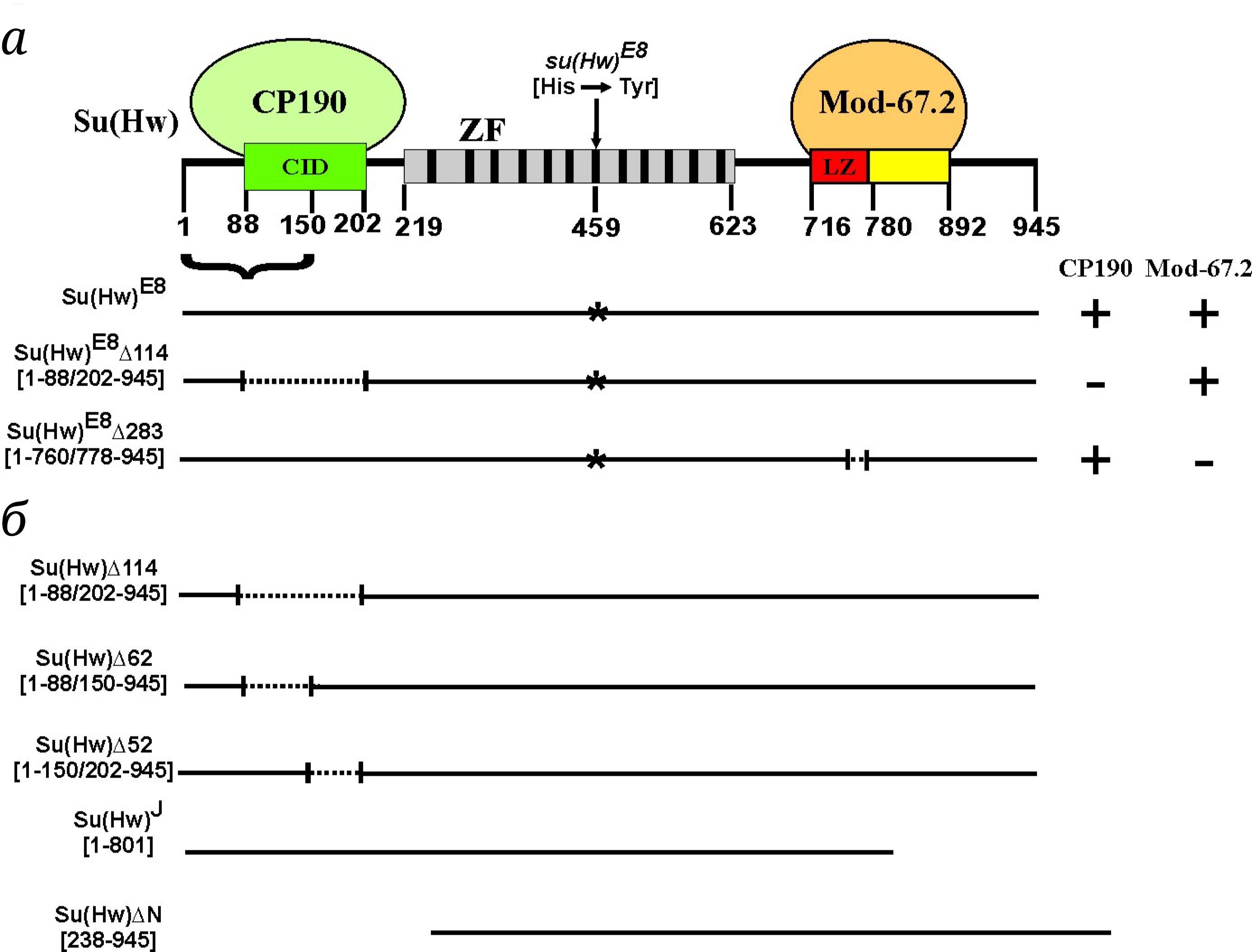 Рис. 1. Производные белка Su(Hw), использованные в работе. a – Схематичное изображение полноразмерного белка Su(Hw). Обозначения доменов: CID – домен, взаимодействующий с СР190; ZF – цинковые пальцы; LZ – лейциновая молния. На схеме показаны районы взаимодействия с белками Mod(mdg4)-67.2 (Mod-67.2) и СР190, которые изображены в виде овалов. Вертикальная стрелка указывает на мутацию su(Hw)E8. Скобкой под схемой указан район белка, к которому были получены антитела. Цифрами обозначены аминокислотные остатки, ограничивающие домены и производные формы. Слева указаны названия производных, размер производных обозначен отрезками, пунктирные линии обозначают внутренние делеции, звёздочкой обозначена мутация su(Hw)E8. Справа от схем приведены результаты, полученные в ДДС. «+» – наличие взаимодействия, «–» – отсутствие взаимодействия. б – Делеционные производные, использованные в генетических экспериментах и в иммуноокрашивании политенных хромосом