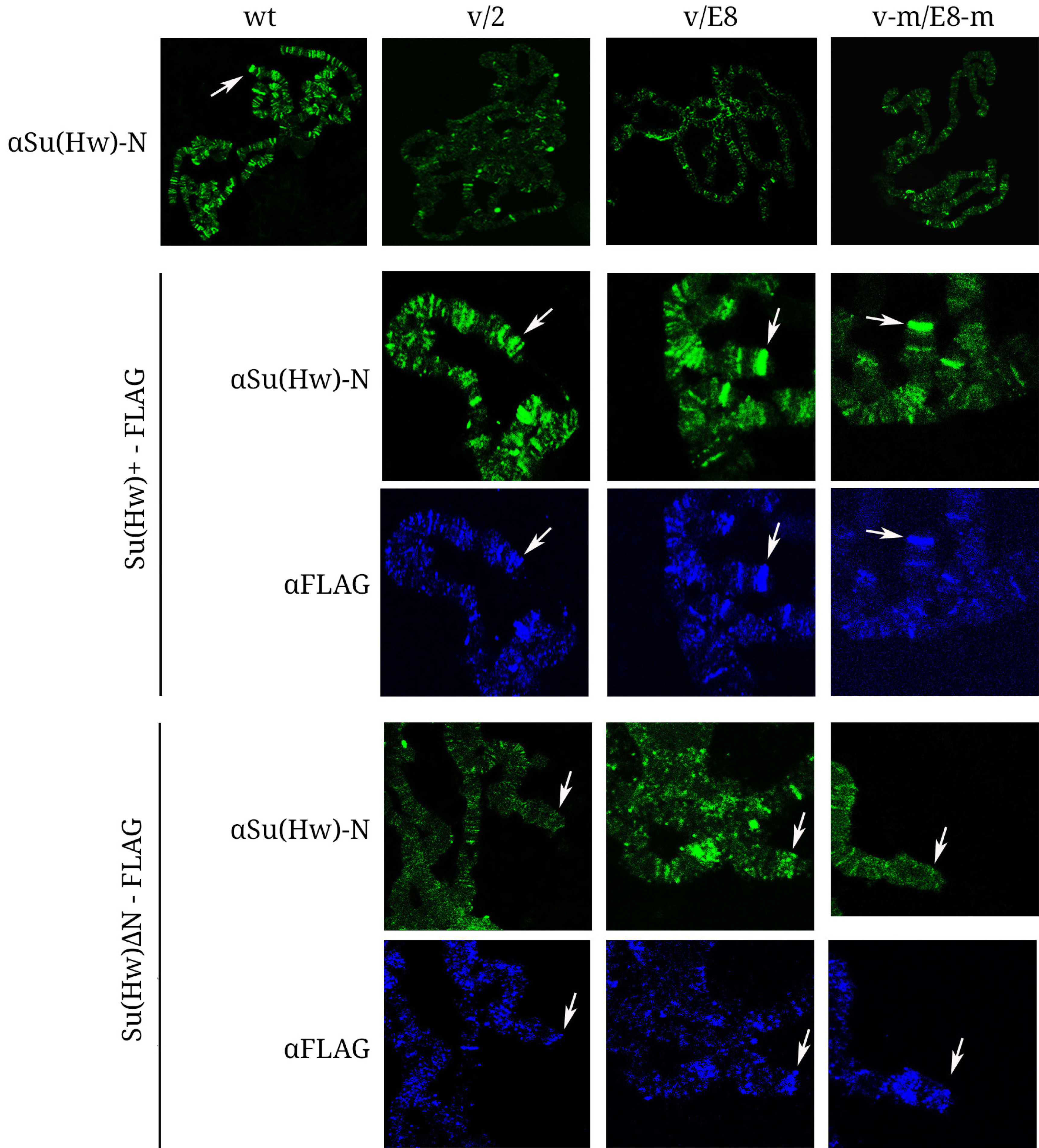 Рис. 3. Связывание белка Su(Hw)E8 с политенными хромосомами. Иммуноокрашивание политенных хромосом слюнных желёз личинок третьего возраста из линий y2ct6 (wt), y2ct6 su(Hw)v/su(Hw)2 (v/2), y2ct6;su(Hw)v/su(Hw)E8 (v/E8), y2ct6;su(Hw)vmod(mdg4)u1/su(Hw)E8mod(mdg4)u1 (v-m/E8-m) и из тех же линий, экспрессирующих белок Su(Hw)ΔN-FLAG или Su(Hw)+-FLAG. В экспериментах использовали антитела к эпитопу FLAG (αFLAG) и к N-концевому домену белка Su(Hw) (αSu(Hw)-N). Стрелки указывают на инсерцию gypsy на конце хромосомы Х