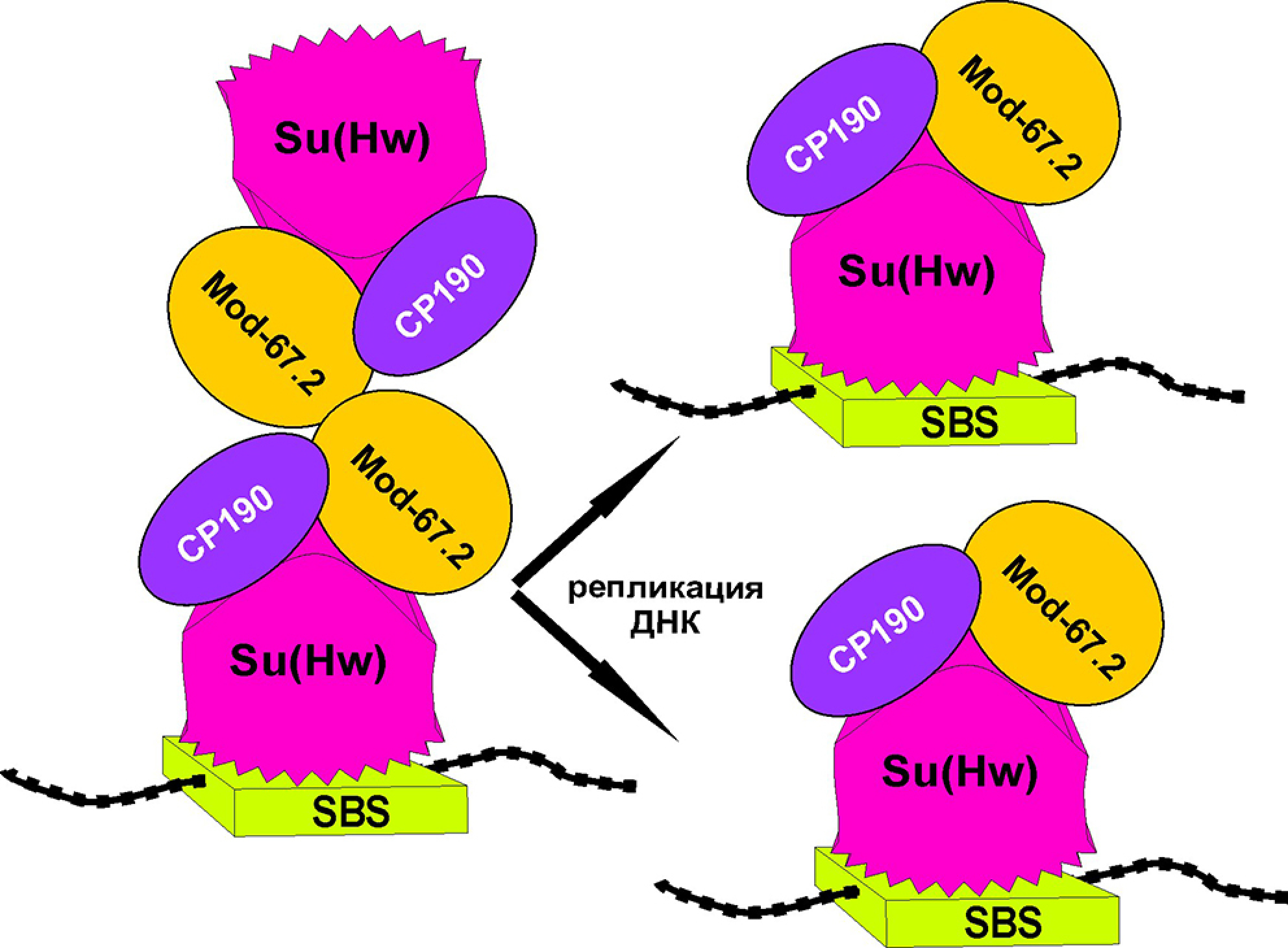 Рис. 5. Модель рекрутирования Su(Hw)-зависимых комплексов на SBS в процессе репликации ДНК