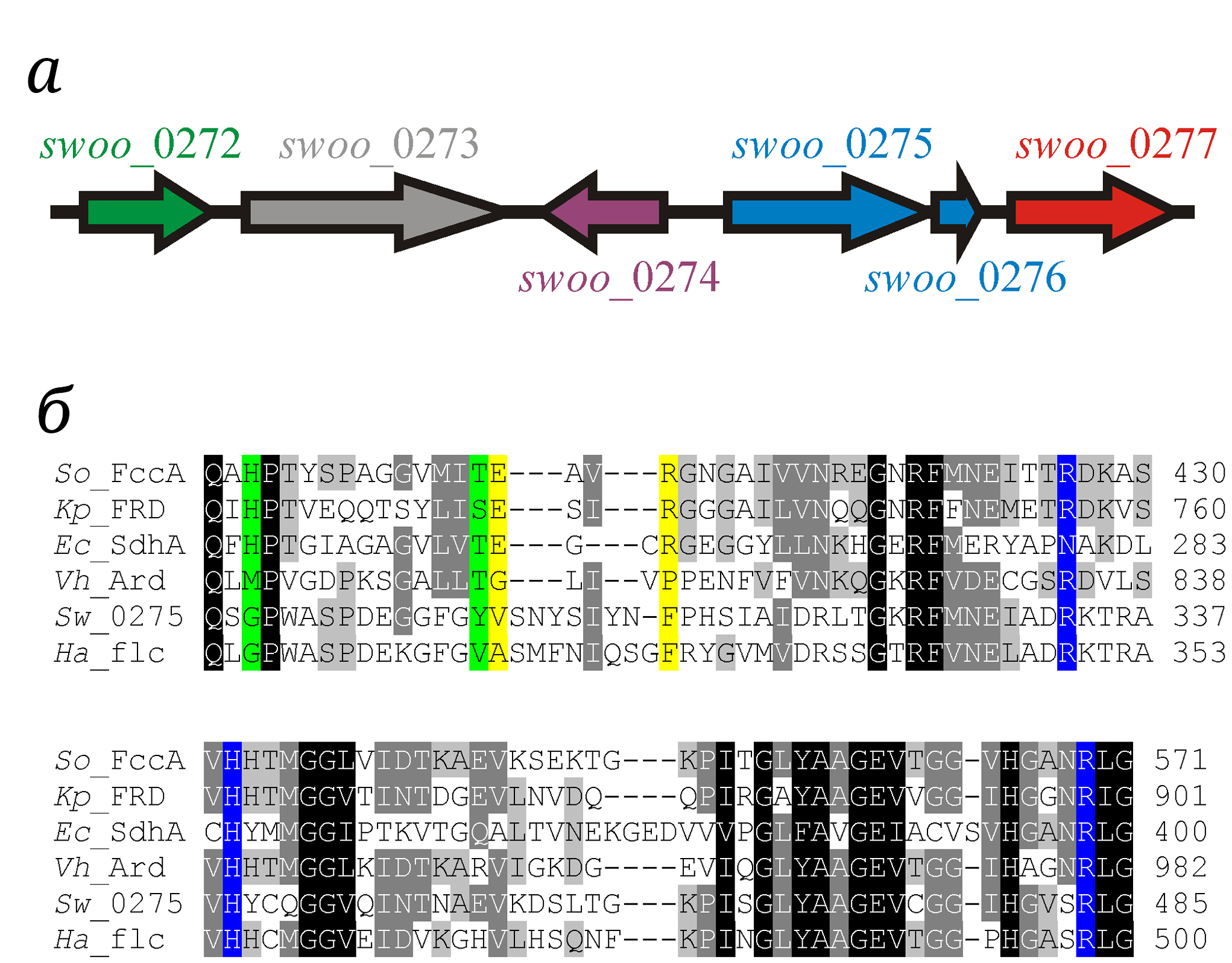 Рис. 2. dddY-Ассоциированные гены морской бактерии Shewanella woodyi. а – Расположение dddY-ассоциированных генов на хромосоме S. woodyi: swoo_0272 – ген NADPH:акрилоил-CoA-оксидоредуктазы; swoo_0273 – гипотетического белка с неизвестными функциями; swoo_0274 – регулятора транскрипции; swoo_0275 – флавинсодержащей субъединицы флавоцитохрома с; swoo_0276 – тетрагемового цитохрома с; swoo_0277 – DMSP-лиазы DddY (https://www.kegg.jp/kegg-bin/show_organism?org=T00676). б – Выравнивание аминокислотных последовательностей цитохром c:фумарат-оксидоредуктазы из S. oneidensis MR-1 (So_FccA, GenBank: AAN54044), NADH:фумарат-оксидоредуктазы из Klebsiella pneumoniae (Kp_Frd, B5XRB0), субъединицы SdhA сукцинатдегидрогеназы из Escherichia coli (Ec_SdhA, HDZ3930178), NADH:акрилат-оксидоредуктазы из V. harveyi (Vh_Ard, P0DW92), белка Swoo_0275 S. woodyi (Sw_0275, ACA84576) и флавоцитохрома c из H. aestuarii (Ha_flc, SHJ73509). Два приведённых фрагмента выравнивания содержат аминокислотные остатки (выделены синим и зелёным цветом), вовлечённые в связывание соответственно C4- и C1-карбоксилатов фумарата в фумаратредуктазах, а также остатки (выделены жёлтым), участвующие в переносе протона к фумарату