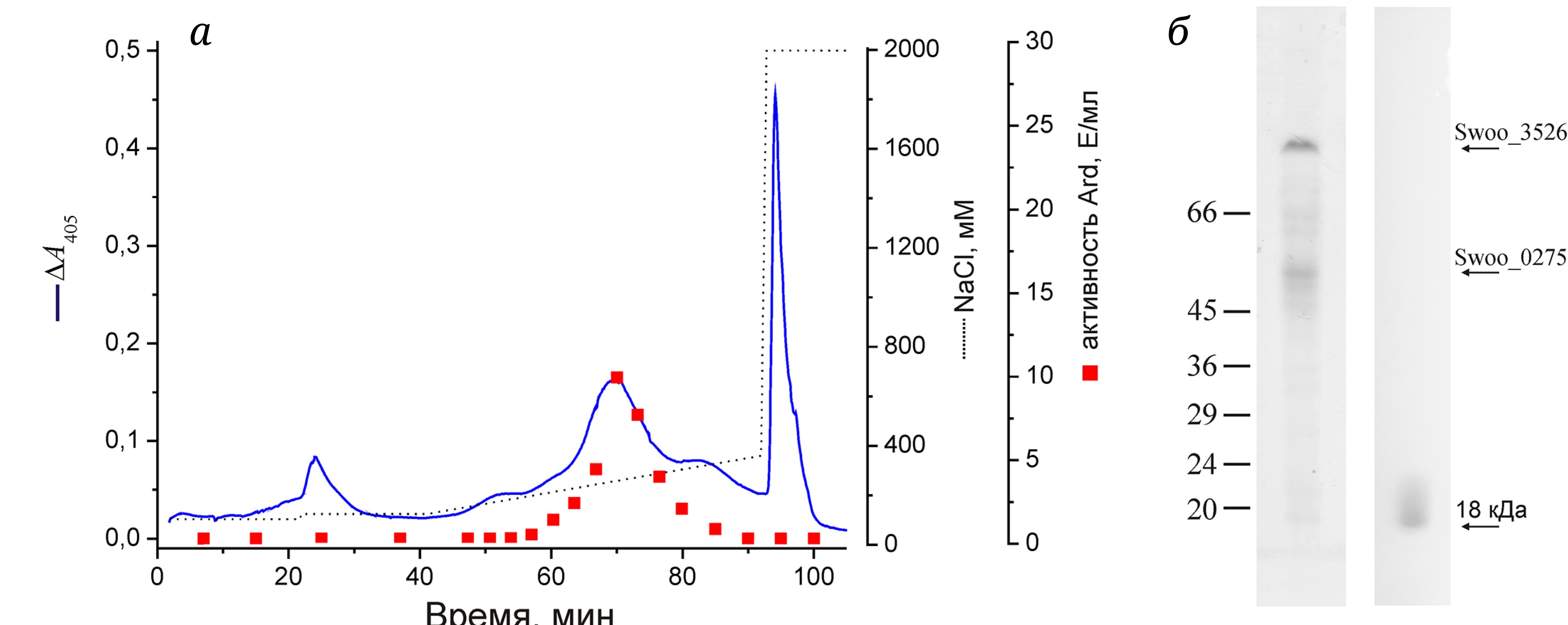 Рис. 3. Выделение Ard из клеток S. woodyi. а – Разделение периплазматической фракции клеток S. woodyi, выращенных анаэробно в присутствии акрилата, с помощью ионообменной хроматографии на DEAE-сефарозе. Поглощение света при 405 нм показано синей кривой, концентрация NaCl показана пунктиром. Красными квадратами обозначена акрилатредуктазная активность в полученных фракциях. б – ДСН-ПААГЭ полученного препарата Ard. На каждую дорожку наносили по 2 мкг белка. Гель окрашивали либо на белок с помощью Кумасси (левая панель), либо на гем C с помощью тетраметилбензидина/H2O2 (правая панель). Полосы с числами с левой стороны указывают положение белковых маркеров молекулярных весов. Белковые полосы, идентифицированные с помощью MALDI-MS, указаны с правой стороны