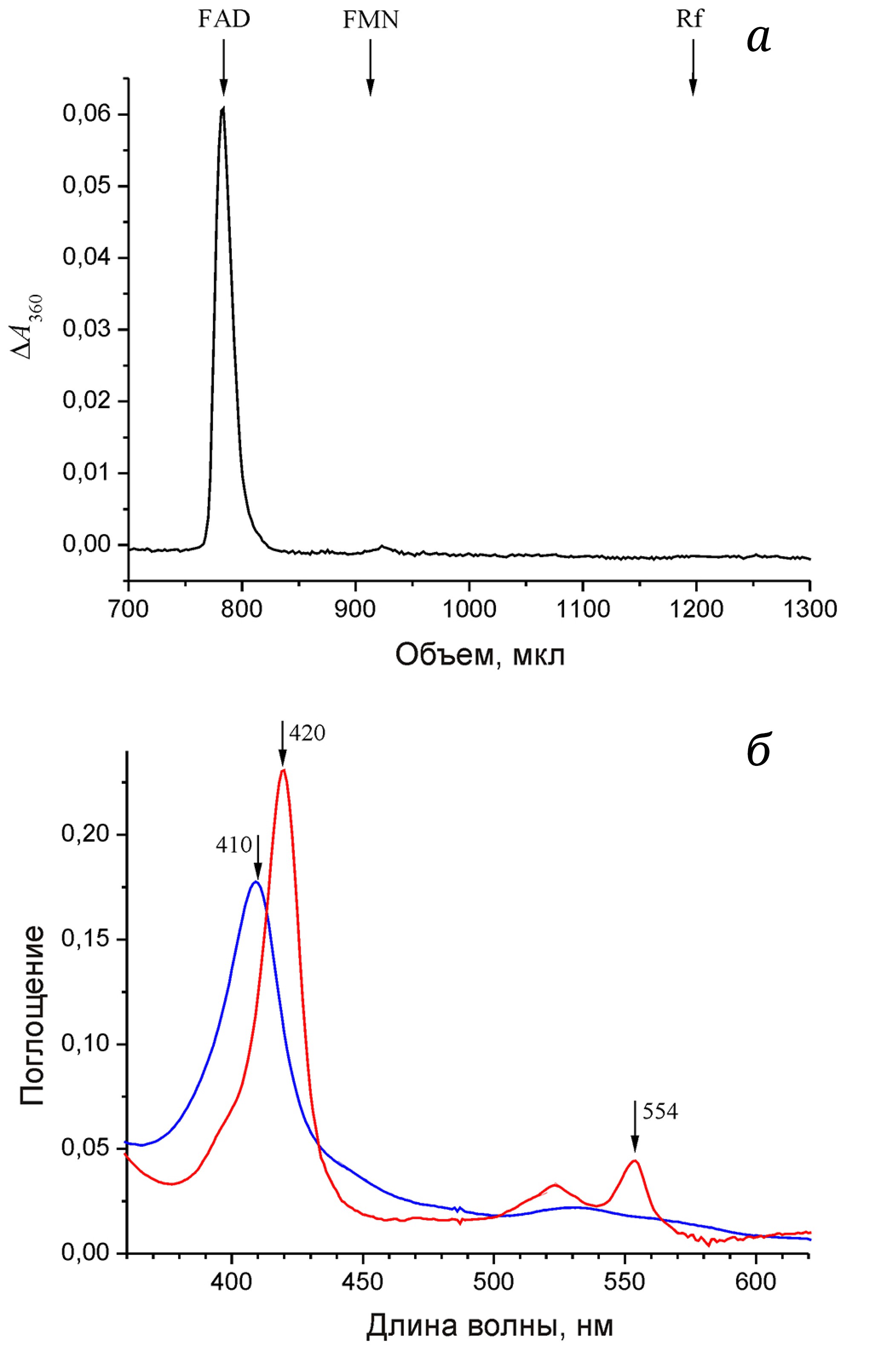 Рис. 4. Идентификация простетических групп Ard. а – Разделение нековалентно связанных с Ard флавинов с помощью ВЭЖХ. Объёмы удержания стандартов FAD, FMN и рибофлавина (Rf) показаны стрелками. б – Спектры поглощения окисленного воздухом (синяя кривая) и восстановленного дитионитом (красная кривая) препаратов Ard. Спектры измеряли в 100 мМ Tris-HCl (pH 8,0) буфере, содержащем 0,1 мг/мл Ard. Специфичные для цитохромов c максимумы поглощения γ- и α-полос показаны стрелками