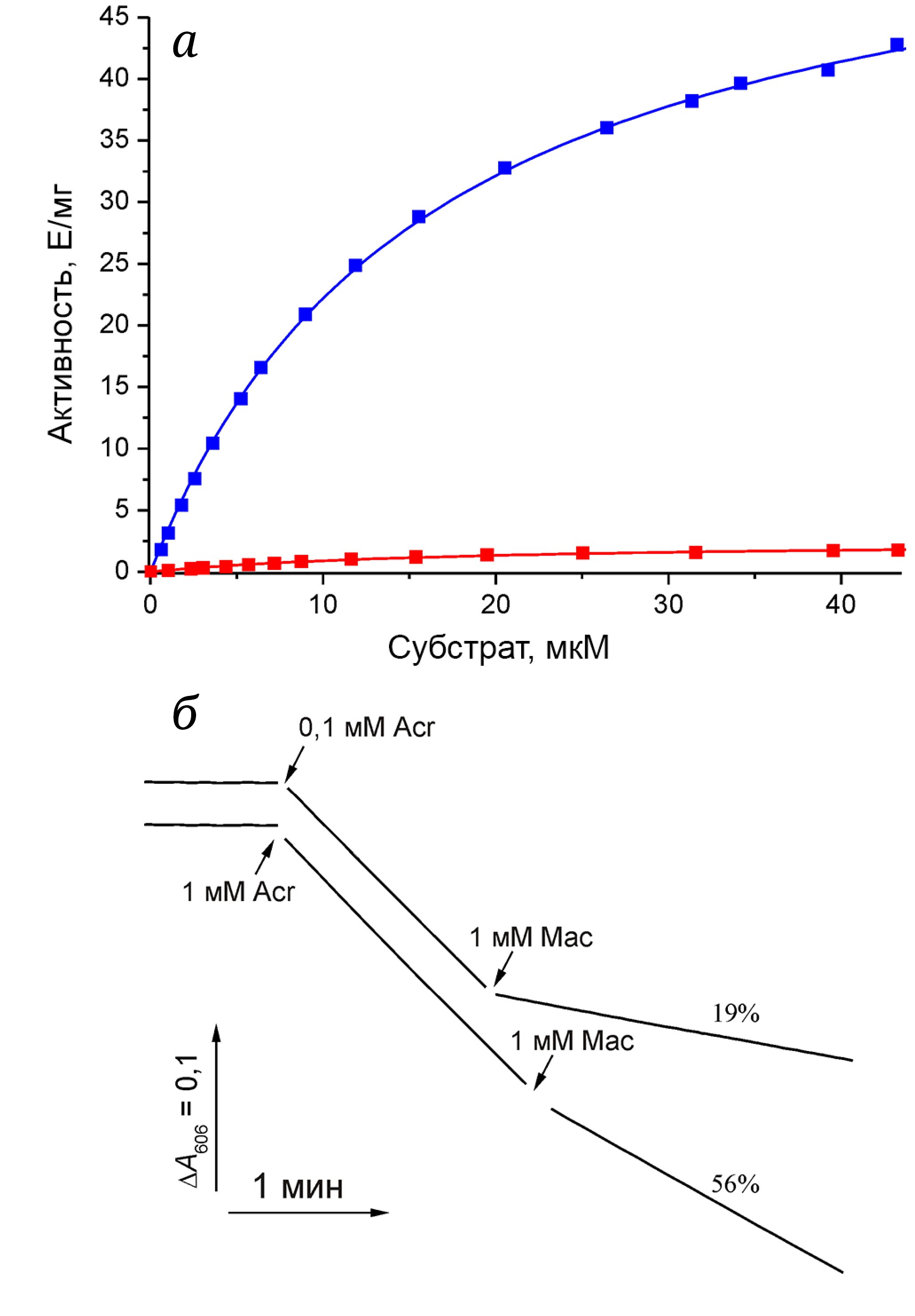 Рис. 5. Каталитические характеристики Ard из S. woodyi. а – Зависимость ферментативной активности Ard от концентрации акрилата (синие квадраты) или метакрилата (красные квадраты). Показаны значения акрилат- и метакрилатредуктазных активностей Ard, полученные с помощью анализа интегральной кинетики восстановления акцепторов в 0,5–50 мкМ диапазоне концентраций (мет)акрилата. Линиями показаны результаты фиттирования полученных данных уравнением Михаэлиса–Ментен (данные для метакрилата в увеличенном масштабе приведены на рис. S2 Приложения). б – Типичные кривые окисления MV в присутствии Ard. Добавки 1 или 0,1 мМ акрилата (Acr) и 1 мМ метакрилата (Mac) указаны стрелками. Числа над кривыми указывают остаточную ферментативную активность Ard после добавки метакрилата, где активность до этой добавки принимали за 100%