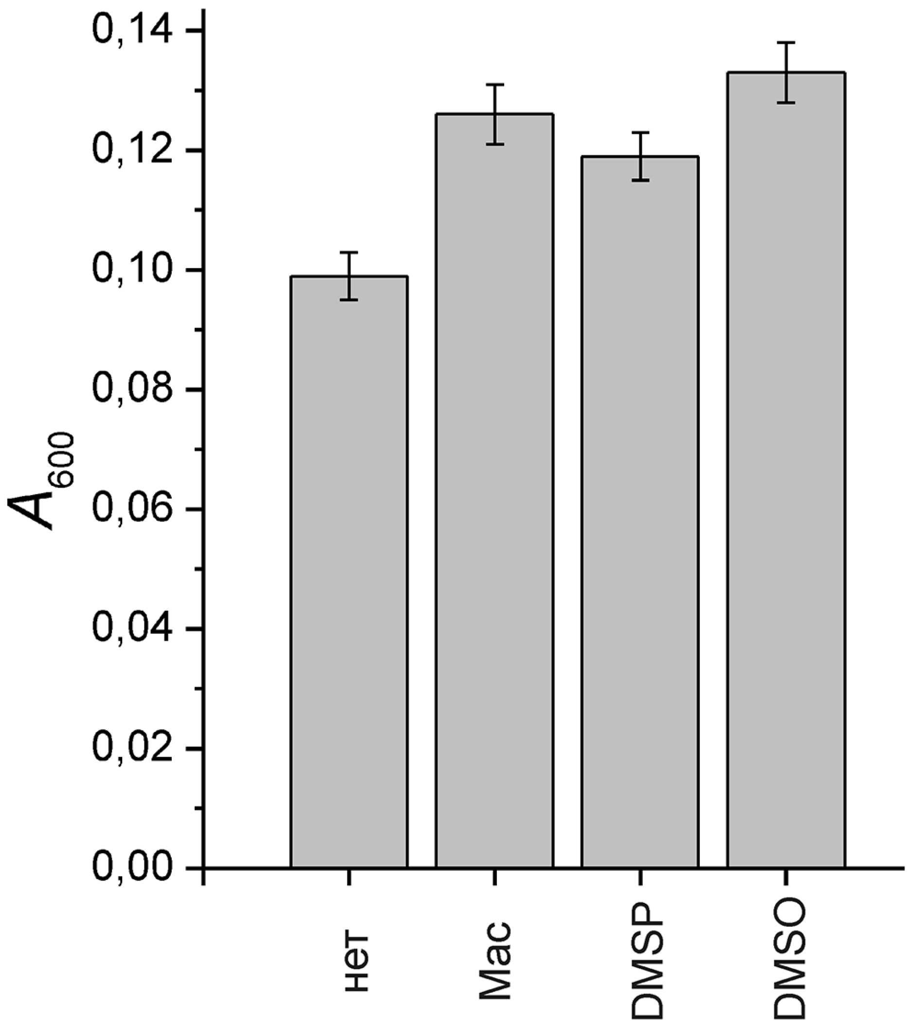 Рис. 6. Анаэробный рост S. woodyi в присутствии различных акцепторов электронов. Начальная оптическая плотность при посеве культуры составляла 0,005. Клетки выращивали анаэробно при 25 °C в течение 18 ч. Где указано, в среду роста добавляли 10 мМ метакрилат (Mac), DMSP или DMSO (столбец «нет» – без добавления акцепторов). Показаны конечные значения оптической плотности культур при 600 нм, планки погрешностей указывают стандартные отклонения для трёх биологических повторов