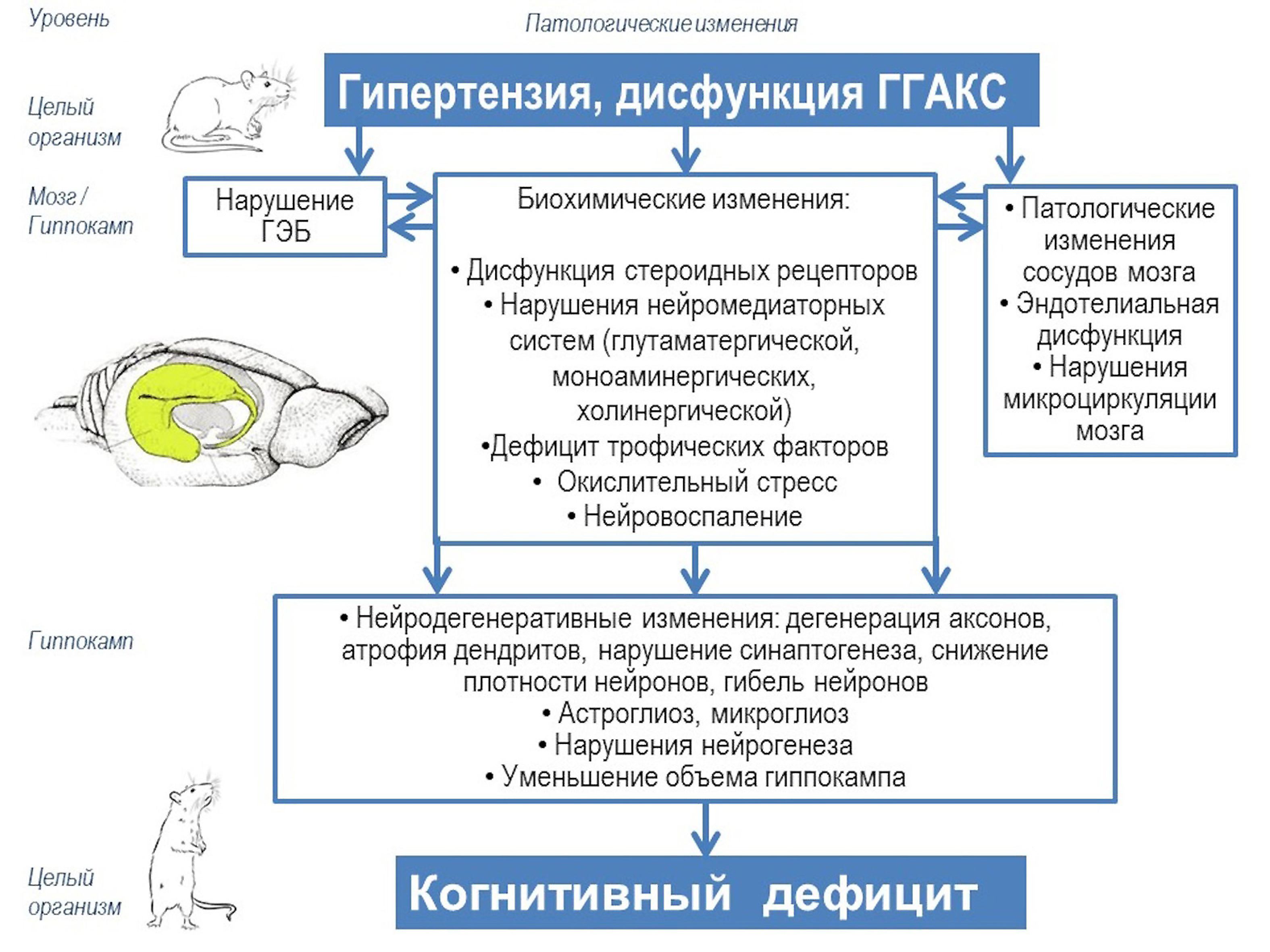 Линия SHR как модель сосудистой деменции: изменения в гиппокампе. Схема показывает, каким образом глобальные изменения на уровне целого организма (гипертензия и нарушение функционирования ГГАКС) последовательно приводят к патологическим биохимическим и структурным изменениям в гиппокампе на фоне сосудистой патологии мозга и нарушения ГЭБ. Нейродегенеративные процессы и патологические изменения нейрогенеза в гиппокампе влияют на его функционирование, приводя в конечном итоге к когнитивным расстройствам, последствия которых реализуются на уровне поведения
