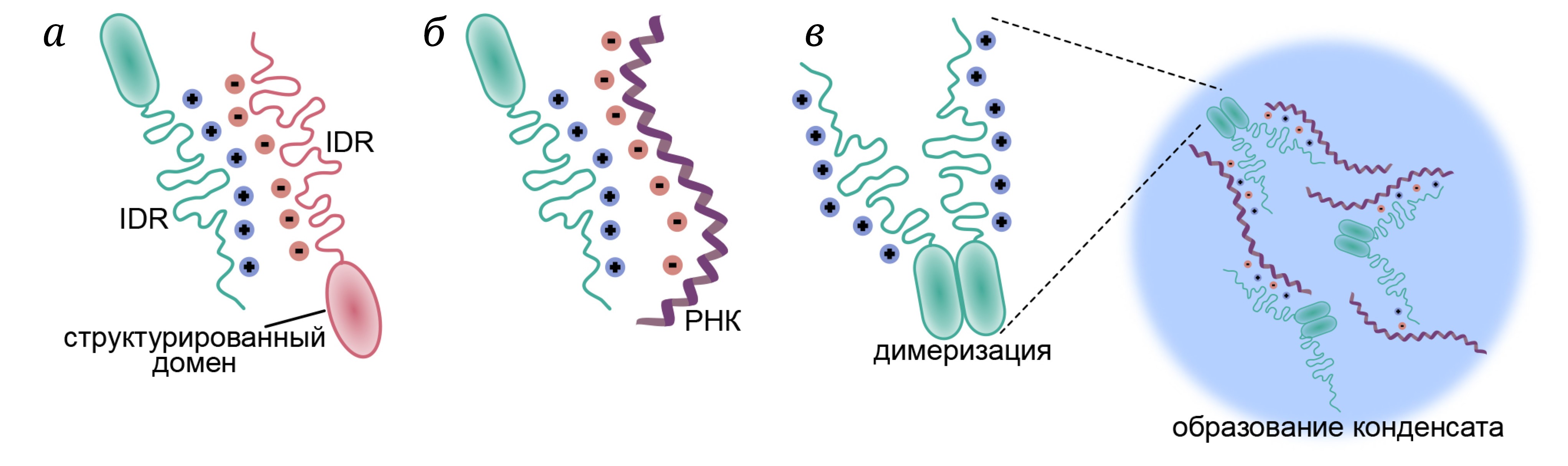 Рис. 1. Роль природно неупорядоченных доменов (IDR) в формировании биомолекулярных конденсатов. а – Электростатические взаимодействия между IDR белков в случае присутствия доменов с разным зарядом. б – Взаимодействия между IDR белка и РНК. в – Формирование биомолекулярного конденсата за счет мультивалентных взаимодействий, обеспечиваемых димерами белков со связывающими молекулы РНК IDR