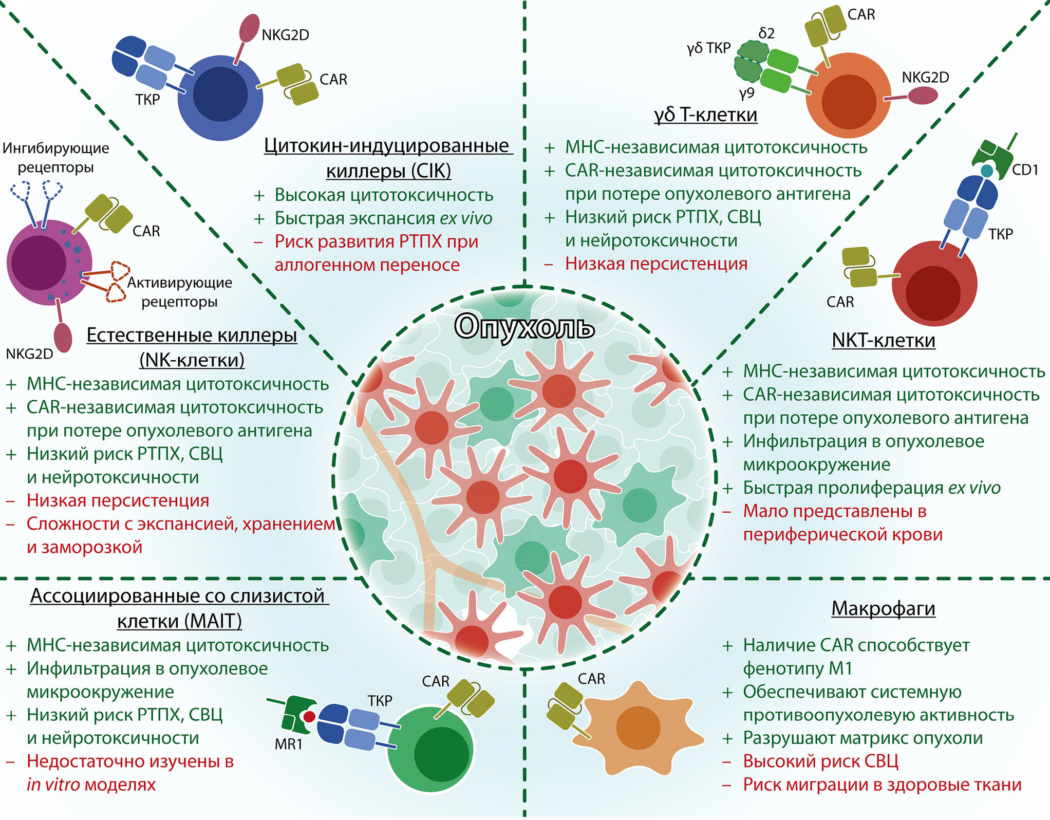 Принятые сокращения: РТПХ – реакция «трансплантат против хозяина»; СВЦ – синдром выброса цитокинов; ТКР – T-клеточный рецептор; CAR – химерный антигенный рецептор; CAR-M – макрофаги, экспрессирующие CAR; CBCR – химерные B-клеточные рецепторы; CIK – цитокин-индуцированные киллеры; DC – дендритные клетки; DN T-клетки – двойные негативные T-клетки; iPSC – индуцированные плюрипотентные стволовые клетки; FDA – Управление по надзору за продуктами и лекарствами; GD2 – дисиалоганглиозид; MAIT – ассоциированные со слизистыми инвариантные T-клетки; MHC – главный комплекс гистосовместимости; NK – естественные киллеры; NKT-клетки – естественные киллерные T-клетки; iNKT – инвариантные NKT-клетки; NSCAR – несигнализирующий CAR; Treg – T-регуляторные клетки.