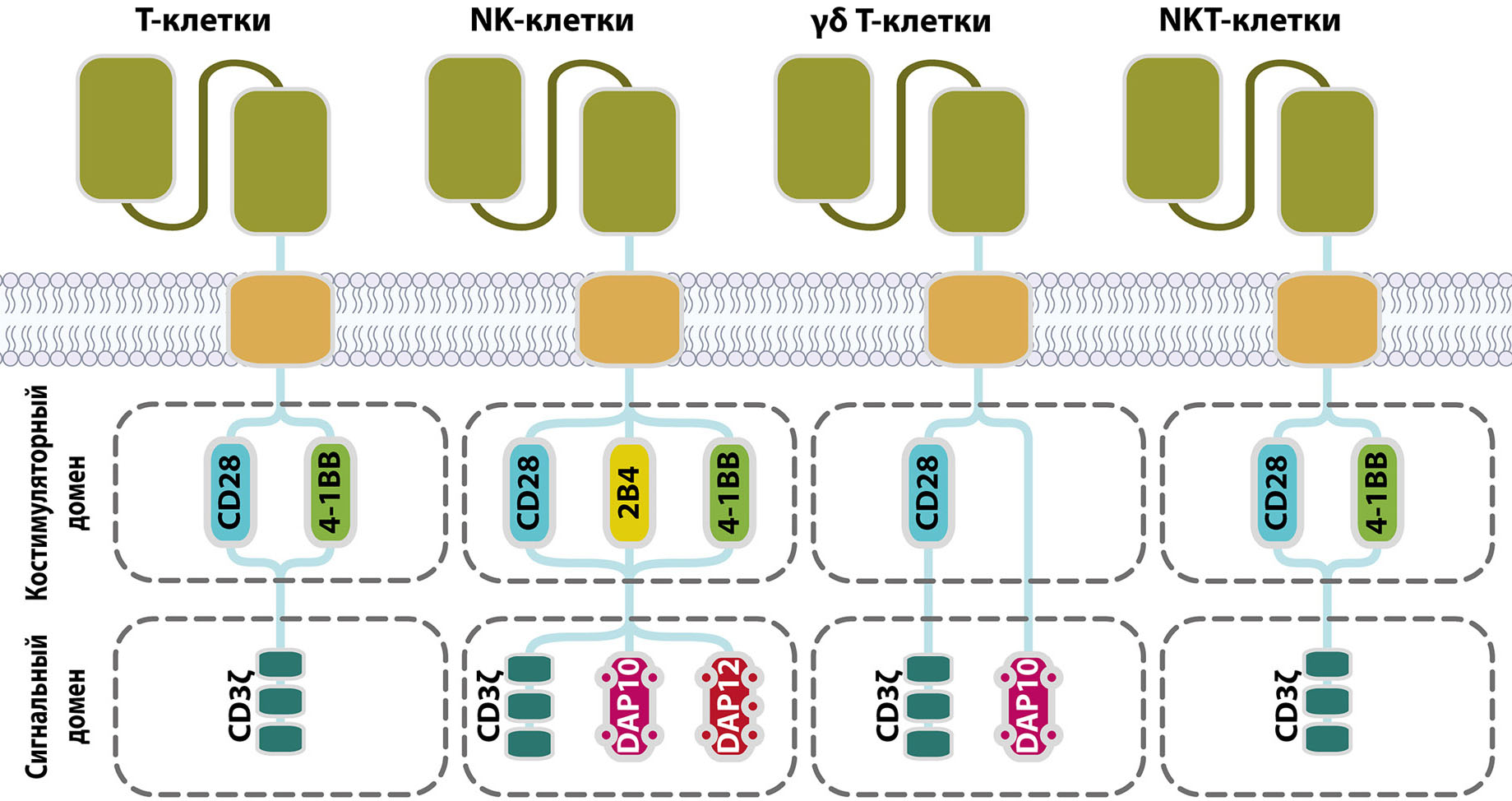Рис. 2. Структура CAR, используемых при создании клеточного продукта из клеток различных типов. NK-Клетки – естественные киллеры, NKT-клетки – естественные киллерные T-клетки