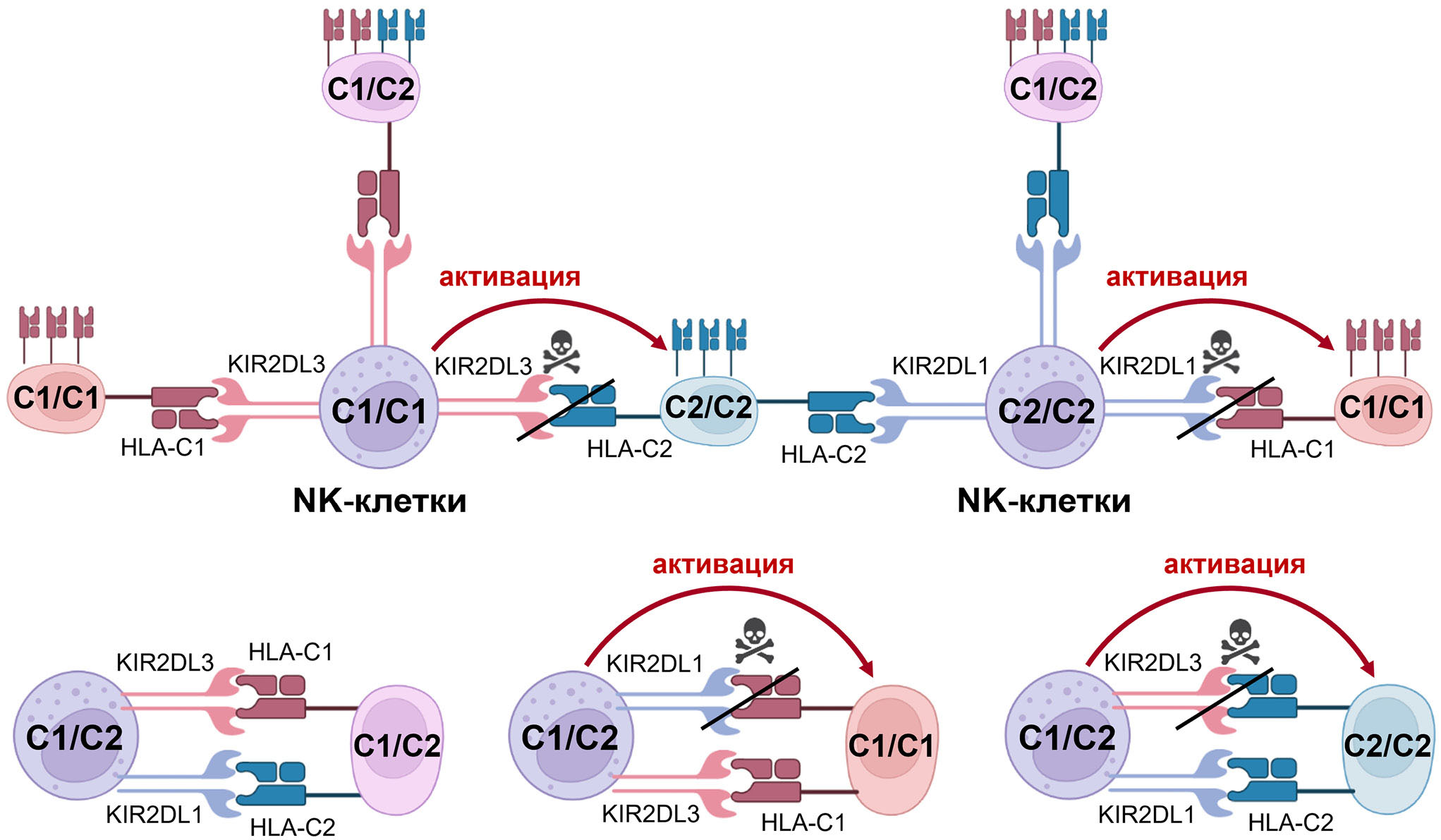Рис. 1. Механизм аллореактивности NK-клетками на примере несоответствия лигандов для KIR2DL-рецепторов. HLA-С1/С1 NK-клетки активируются при взаимодействии с HLA-С2/С2 клетками-мишенями (нет ингибирующего сигнала через KIR2DL3-рецептор). HLA-С2/С2 NK-клетки активируются при взаимодействии с HLA-С1/С1 клетками-мишенями (нет ингибирующего сигнала через KIR2DL1-рецептор). HLA-С1/С2 NK-клетки активируются при взаимодействии с HLA-С1/С1 клетками-мишенями (нет ингибирующего сигнала через KIR2DL1-рецептор) и при взаимодействии с HLA-С2/С2 клетками-мишенями (нет ингибирующего сигнала через KIR2DL3-рецептор)