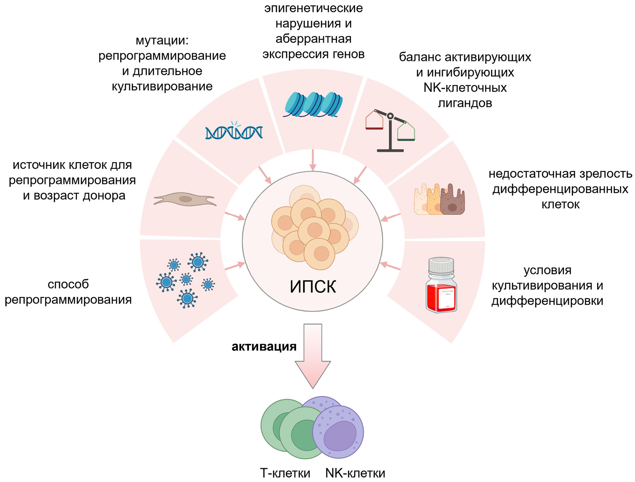До сих пор нет четкого понимания, что является ключевым фактором иногда наблюдавшейся иммуногенности производных ИПСК аутологичного происхождения. В целом, ответ со стороны T-клеток может быть объяснен формированием неоантигенов и аберрантной экспрессией генов (рис. 2, а), а ответ со стороны NK-клеток – нарушением баланса активирующих и ингибирующих лигандов в клетках-мишенях (рис. 2, б).