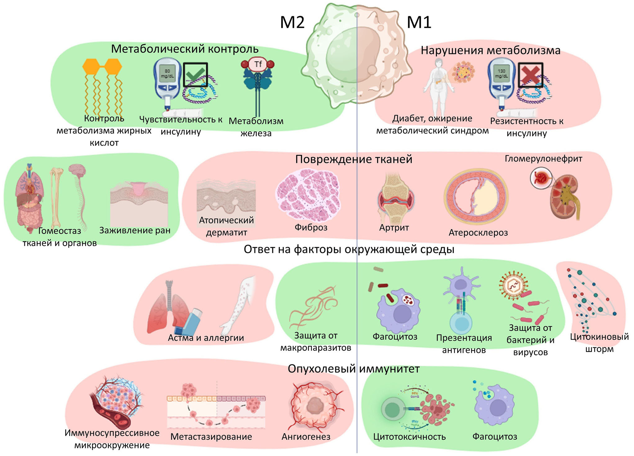 Рис. 2. Поляризация макрофагов в норме и патологии. Розовым обозначены процессы, в которых данный вид поляризации сопряжен с патологией, зеленым – процессы, в которых макрофаги играют физиологическую роль. Рисунок сделан с помощью программы BioRender по ранее опубликованный материалам [23, 151]