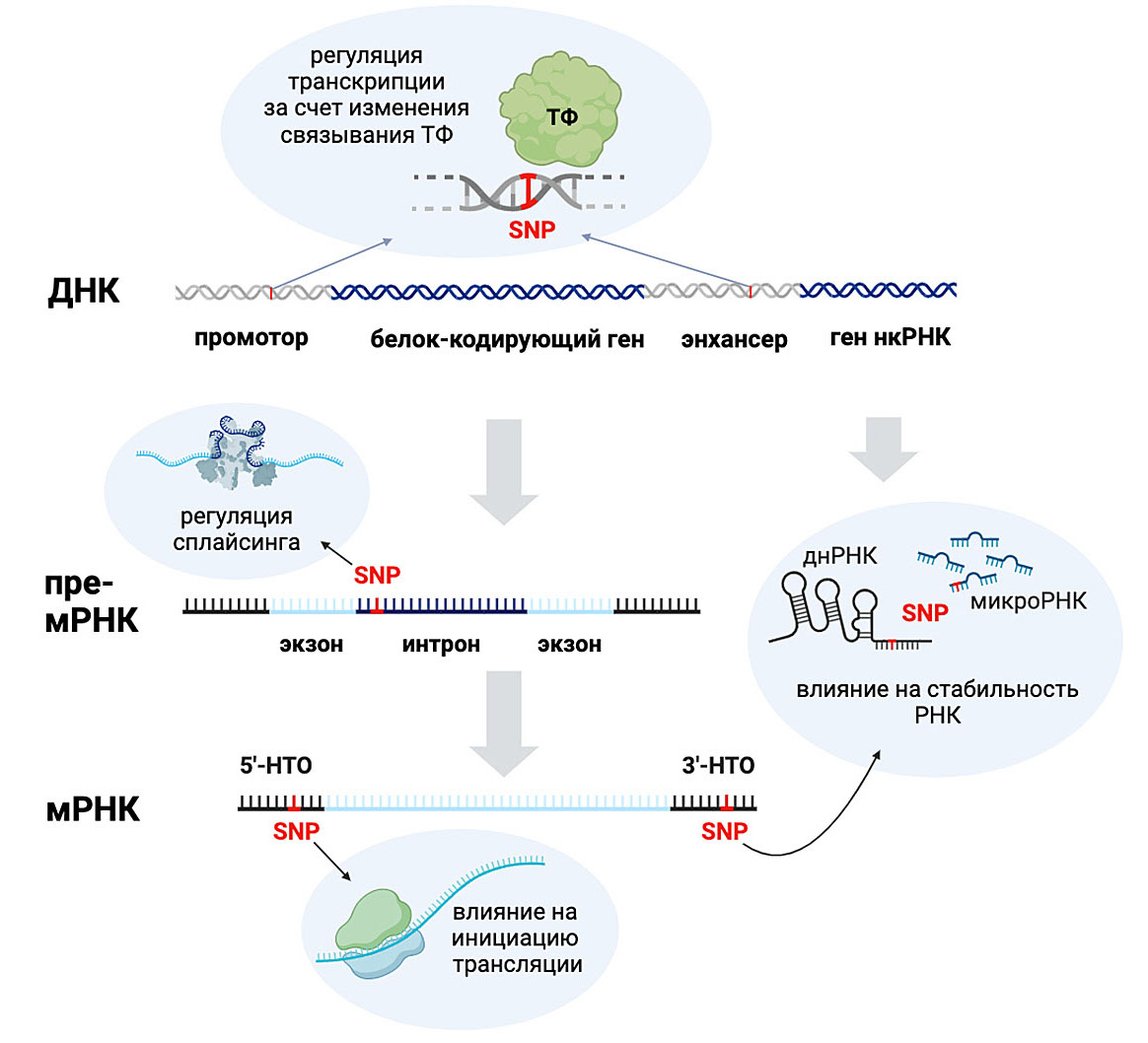 Рис. 1. Основные механизмы влияния некодирующих полиморфизмов на регуляцию экспрессии генов (изображение сделано с помощью BioRender.com)