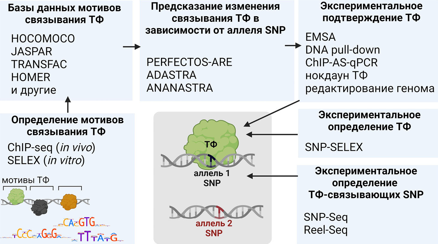 Рис. 2. Методы определения функциональных транскрипционных факторов, аллель-специфически связывающихся с областью полиморфизма (изображение сделано с помощью BioRender.com)