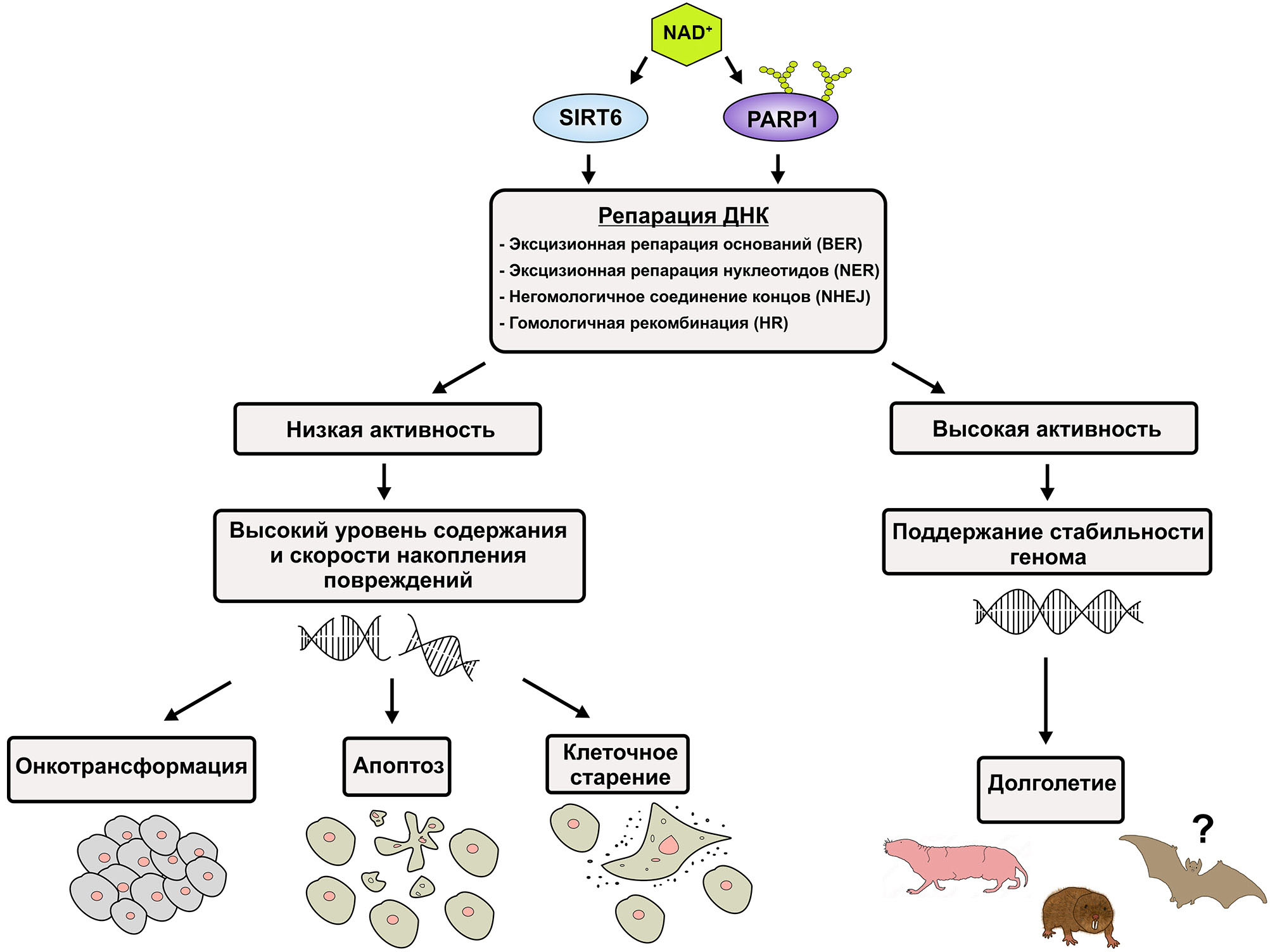 Целью данного обзора является рассмотрение актуальных данных об активности систем репарации ДНК в клетках долгоживущих грызунов и летучих мышей. Первая часть обзора посвящена описанию результатов исследования активности систем репарации ДНК в клетках этих млекопитающих. Во второй части обзора обсуждаются результаты исследования активности NAD+-зависимых поли(ADP-рибоза)-полимеразы 1 (poly (ADP–ribose)polymerase 1, PARP1) и гистондеацетилазы сиртуина 6 (sirtuin 6, SIRT6), как основных белков-регуляторов процессов репарации ДНК. Обзор частично перекрывается с недавно опубликованными работами Yamamura et al. [19], Gorbunova et al. [20] и Boughey et al. [21]. Представленная в обзоре информация о результатах, полученных при исследовании процессов репарации ДНК в клетках долгоживущих грызунов и летучих мышей, может быть актуальна и полезна для исследователей, нацеленных не только на изучение молекулярных основ долголетия млекопитающих, в том числе человека, но и на разработку эффективных стратегий продления жизни и лечение заболеваний, ассоциированных со старением.