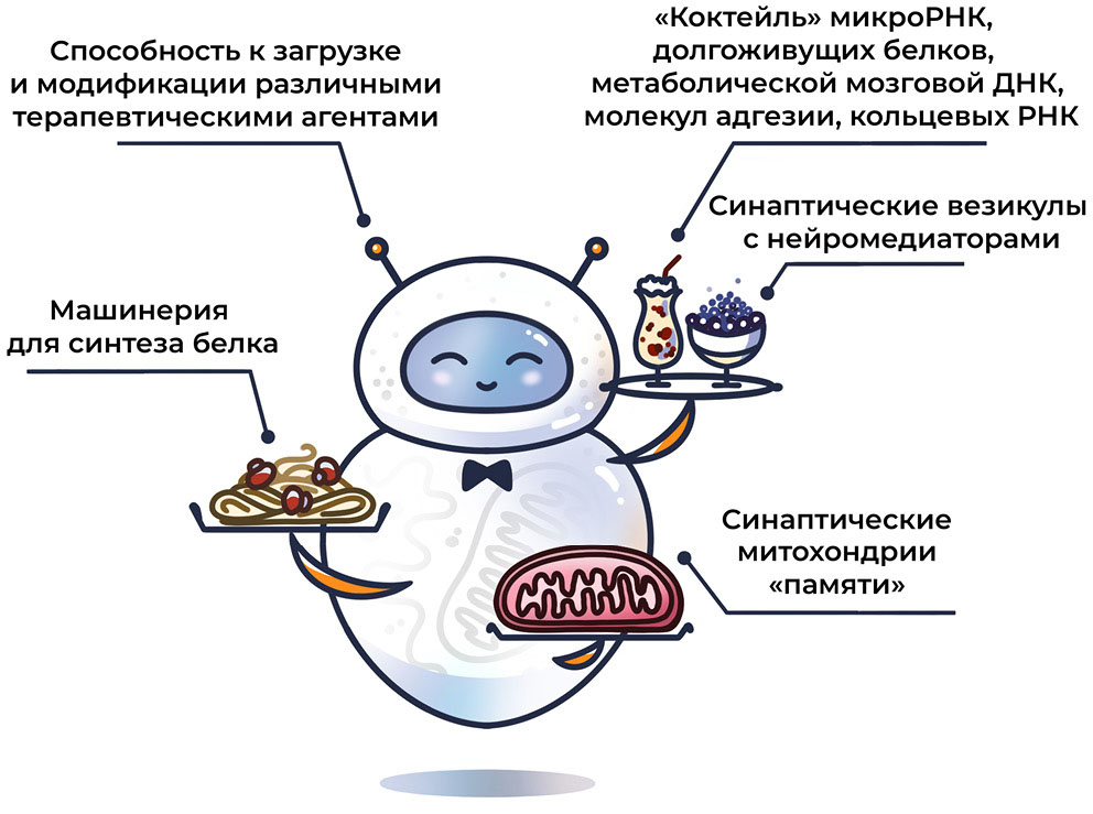 Потенциал синаптосом не ограничивается только возможностью доставки содержащихся в них митохондрий. Уникальный состав синаптосом, их структурные и функциональные особенности позволяют им оказывать влияние на когнитивные процессы и дают возможность рассматривать их в качестве перспективного комплексного средства терапии БА и других нейродегенеративных заболеваний. Мы считаем, что функциональные синаптосомы являются многообещающим агентом для комплексной терапии: они сочетают в себе уникальные свойства и способности митохондрий, обладают стабильным и безопасным составом и имеют мембранную защиту как у ЭВ, позволяющую использовать их как в свободном виде, так и модифицировать их поверхность и нагружать дополнительными веществами (рис. 1).