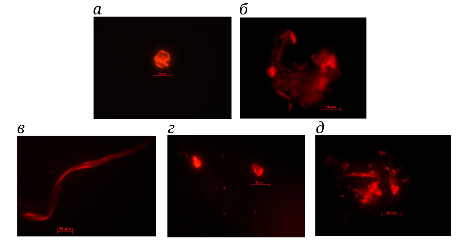 Рис. 2. Флуоресцентная микроскопия окрашенных тиофлавином Т агрегатов. а – YpOmpFt после инкубации в фосфатно-цитратном буферном растворе (pH 4,5) в течение 4-х недель при 42 °C. б – YpOmpFt после прогрева при 95 °C в течение 5 ч в Tris-HCl-буфере (pH 7,4) с последующей выдержкой образца при 25 °C в течение 10 суток. в – Рекомбинантный мутантный порин c делецией наружной петли 6 (RР_del6), образец хранился в фосфатно-солевом буферном растворе (pH 7,4) в присутствии 0,01%-ного Zw 3-14 при 4 °C в течение 6 месяцев. г – YpOmpFt после инкубации в фосфатно-цитратном буферном растворе (pH 4,5) в течение 2-х недель при 42 °C и прогрева при 95 °C в течение 5 ч. д – YpOmpFt после инкубации в условиях, указанных для панели (г) и последующей выдержки при 25 °C в течение 10 суток. Изображения получены с помощью микроскопа AXIO Imager. A1 (Zeiss); объектив – ECPlan-NEOFLUAR 40 × 0,75. Масштаб: 50 мкм