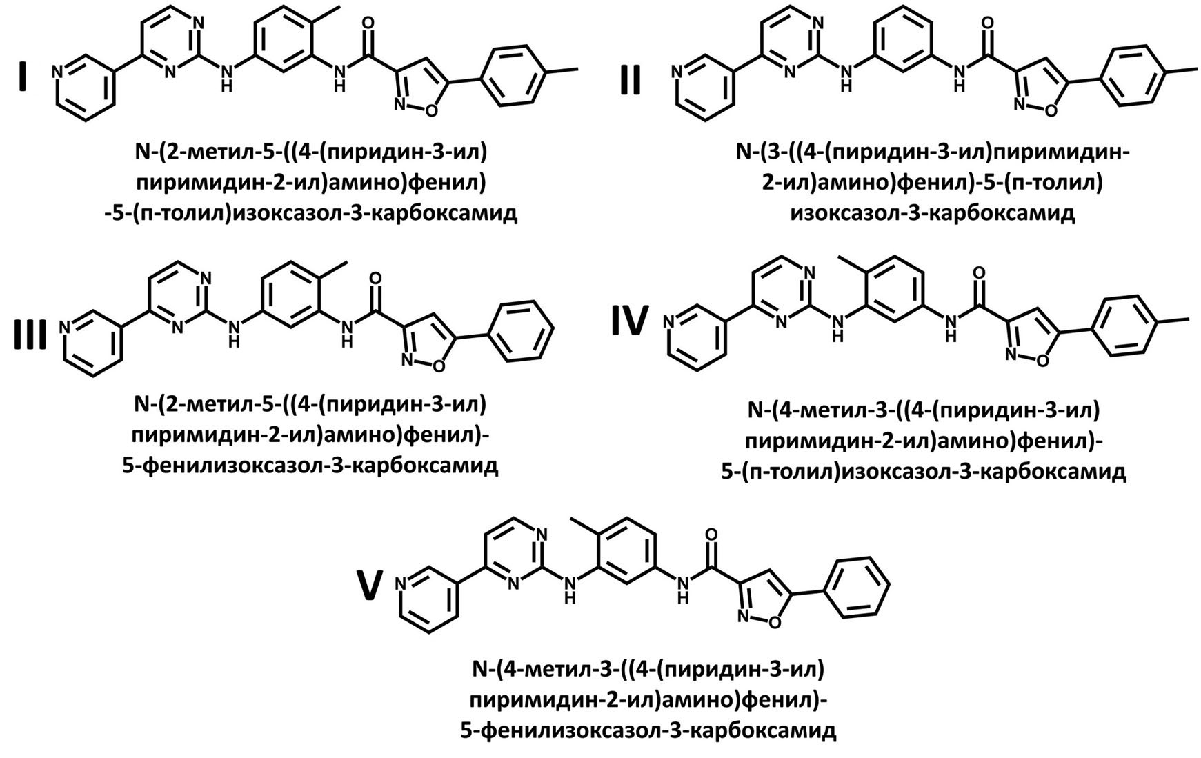 Теоретическая часть. Дизайн потенциальных ингибиторов тирозинкиназы Bcr-Abl. Способность соединений 2-ариламинопиримидинового ряда блокировать процесс канцерогенеза путем ингибирования протеинкиназ обусловила использование пиримидинового гетероцикла в качестве ключевого фармакофора многих соединений, на основе которых разработаны эффективные противораковые лекарства [11, 15, 20, 23, 24]. Дизайн гибридных молекул осуществляли путем объединения 2-ариламинопиримидинового фармакофора с фрагментом 5-арилзамещенного изоксазола, используя различные комбинации метильных заместителей в кислотном и аминном остатках амида. В структурах целевых амидов присутствовали два фармакофорных фрагмента – 2-аминопиримидин в аминном остатке и изоксазол в кислотном остатке, связанные между собой через фениламидный линкер. При этом кислотные и аминные остатки в амиде соединяли амидным линкером, способным образовывать водородные связи в активном центре тирозинкиназы Bcr-Abl. В результате были сконструированы пять химерных молекул, различающихся положением метильных заместителей в кислотном остатке и аминосодержащем остатке. Согласно данным работы Schönherr и Cernak [25], варьирование положений метильных заместителей в структурах биоактивных молекул может оказывать существенное влияние на их ингибиторную активность и в отдельных случаях приводит к ее увеличению более чем на 2 порядка. Эти данные обусловили использование в настоящем исследовании стратегии «магического метильного эффекта» [25] для дизайна потенциальных ингибиторов тирозинкиназы Bcr-Abl на основе химерных молекул, объединяющих ключевые фармакофоры разных противоопухолевых агентов, нацеленных на разные терапевтические мишени.