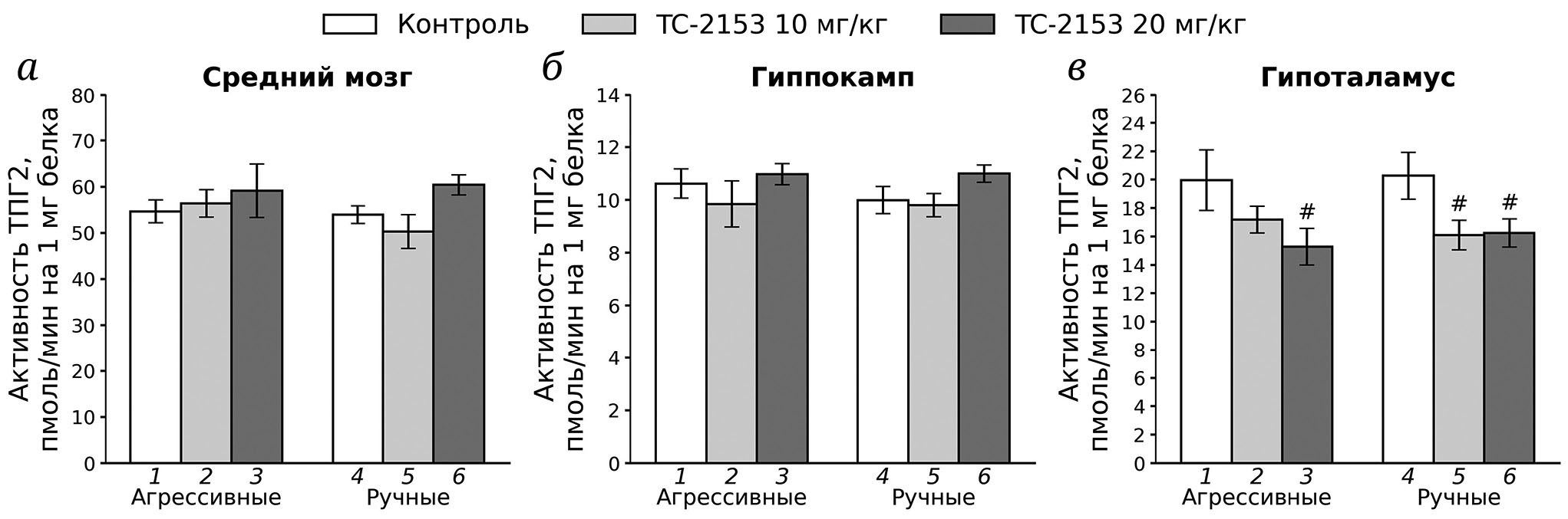 Рис. 1. Влияние однократного введения растворителя (контроль) и ТС-2153 в дозировках 10 и 20 мг/кг на активность ТПГ2 (пмоль/мин на 1 мг белка) in vitro в среднем мозге (а), гиппокампе (б) и гипоталамусе (в) у агрессивных и ручных крыс. # p < 0,05 в сравнении с контрольной группой (7–8 животных в группе). 1 – Агрессивные, контроль; 2 – агрессивные, ТС-2153: 10 мг/кг; 3 – агрессивные, ТС-2153: 20 мг/кг; 4 – ручные, контроль; 5 – ручные, ТС-2153: 10 мг/кг; 6 – ручные, ТС-2153: 20 мг/кг