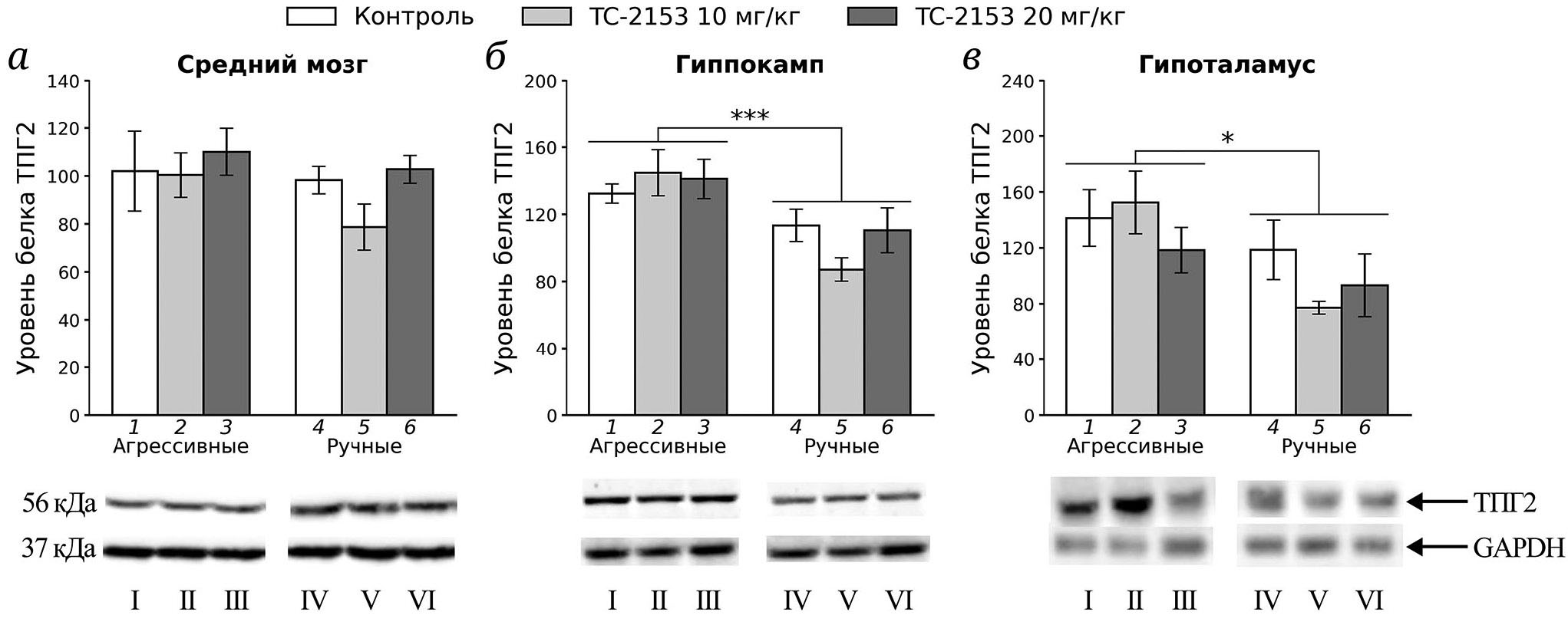 Рис. 3. Влияние однократного введения растворителя (контроль) и ТС-2153 в дозировках 10 и 20 мг/кг на уровень белка ТПГ2 в среднем мозге (а), гиппокампе (б) и гипоталамусе (в) у агрессивных и ручных крыс. Уровень белка представлен в относительных единицах, нормализованных на соответствующий уровень белка GAPDH. * p < 0,05, *** p < 0,001 – эффект генотипа (5–8 животных в группе). 1 – Агрессивные, контроль; 2 – агрессивные, ТС-2153: 10 мг/кг; 3 – агрессивные, ТС-2153: 20 мг/кг; 4 – ручные, контроль; 5 – ручные, ТС-2153: 10 мг/кг; 6 – ручные, ТС-2153: 20 мг/кг. Часть результатов иммуноблота на мембране, использованных для обсчёта уровня белка ТПГ2: I – агрессивные, контроль; II – агрессивные, ТС-2153: 10 мг/кг; III – агрессивные, ТС-2153: 20 мг/кг; IV – ручные, контроль; V – ручные, ТС-2153: 10 мг/кг; VI – ручные, ТС-2153: 20 мг/кг