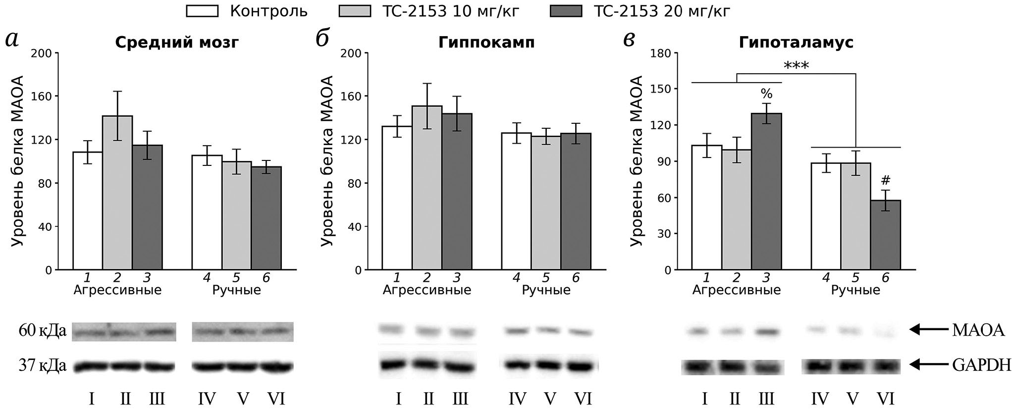 Рис. 6. Влияние однократного введения растворителя (контроль) и ТС-2153 в дозировках 10 и 20 мг/кг на уровень белка МАОА в среднем мозге (а), гиппокампе (б) и гипоталамусе (в) у агрессивных и ручных крыс. Уровень белка представлен в относительных единицах, нормализованных на соответствующий уровень белка GAPDH. *** p < 0,001 – эффект генотипа, # p < 0,05, % p = 0,056 в сравнении с контрольной группой (4–8 животных в группе). 1 – Агрессивные, контроль; 2 – агрессивные, ТС-2153: 10 мг/кг; 3 – агрессивные, ТС-2153: 20 мг/кг; 4 – ручные, контроль; 5 – ручные, ТС-2153: 10 мг/кг; 6 – ручные, ТС-2153: 20 мг/кг. Часть результатов иммуноблота на мембране, использованных для обсчёта уровня белка МАОА: I – агрессивные, контроль; II – агрессивные, ТС-2153: 10 мг/кг; III – агрессивные, ТС-2153: 20 мг/кг; IV – ручные, контроль; V – ручные, ТС-2153: 10 мг/кг; VI – ручные, ТС-2153: 20 мг/кг