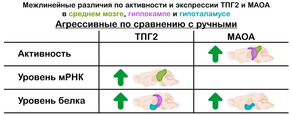 Для изучения механизмов определённого типа поведения широко используются генетические селекционные модели животных. Одной из таких моделей, созданной для изучения агрессии, вызванной страхом, и доместикации, являются крысы, селекционируемые в Институте цитологии и генетики в Новосибирске. Отбор ведётся в двух направлениях: на высокий уровень агрессии по отношению к человеку (агрессивные крысы) и её полное отсутствие (ручные крысы). Полученные линии, помимо прочего, демонстрируют различия в серотониновой системе: по общему уровню этого медиатора и его метаболита в мозге [19, 20], по экспрессии и активности серотониновых рецепторов [20–25], по экспрессии гена транспортера серотонина [26]. У агрессивных крыс по сравнению с ручными на 24-м поколении селекции наблюдалось снижение активности ТПГ2 в среднем мозге [20]. В то же время активность МАОА не различалась между двумя линиями 35–36 поколений [27].