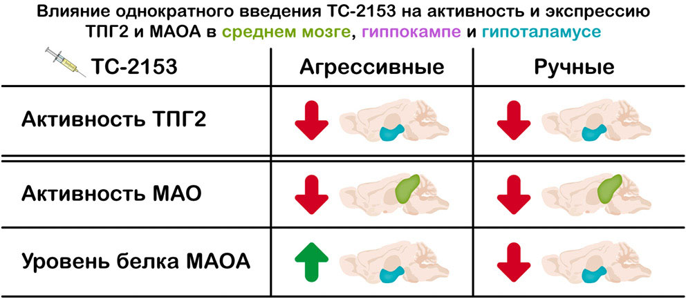 В то же время влияние ТС-2153 на экспрессию ТПГ2 и МАОА у агрессивных и ручных крыс ранее не было изучено. Более того, уровни данных белков и экспрессия генов, их кодирующих, не изучались у этих животных. Таким образом, целью этой работы было исследование влияния однократного введения ТС-2153 на активность и экспрессию ТПГ2 и МАОА в мозге агрессивных и ручных крыс.