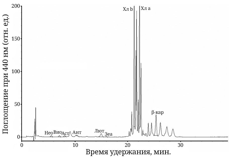 Известно, что фотосинтетический аппарат зеленых одноклеточных водорослей аналогичен таковому высших растений. Хроматографическое разделение экстрактов зеленых клеток C. reticulata (рис. 1, б), выращенных в лабораторных условиях, и красных (покоящихся) клеток (рис. 1, г), собранных с поверхности «цветущего» снега на Приполярном Урале, показало, что в составе фотосинтетических Кар были обнаружены неоксантин, виолаксантин, антераксантин, лютеин, β-каротин и следовые количества зеаксантина (табл. 1; рис. 3, a). При этом β-кар преобладал и в покоящихся клетках (до 90%), и в зеленых клетках C. reticulata (до 38%). Пигментный состав клеток C. reticulata сходен с другими зелеными водорослями [38–40].