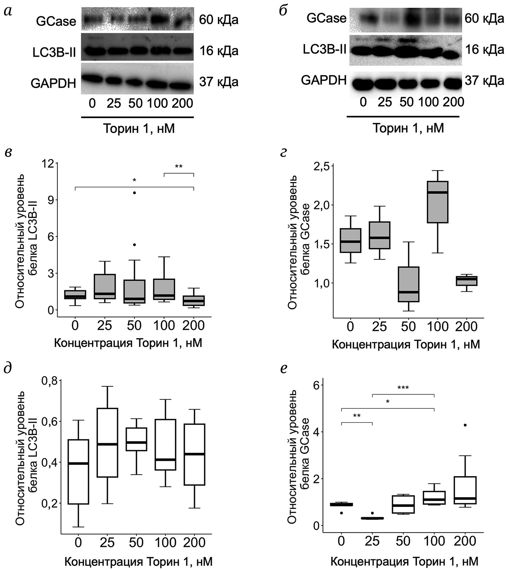 Рис. 2. Влияние дозозависимого ингибирования протеинкиназы mTOR Торином 1 на уровень белков LC3B-II и GCase. а – Данные вестерн-блота для белков LC3B-II и GCase в первичной культуре макрофагов периферической крови; б – данные вестерн-блота для белков LC3B-II и GCase в клеточной линии нейробластомы SH-SY5Y. в – Относительный уровень белка LC3B-II в первичной культуре макрофагов периферической крови (n = 6, где n – число независимых образцов); г – относительный уровень белка GCase в первичной культуре макрофагов периферической крови (n = 6, где n – число независимых образцов); д – относительный уровень белка LC3B-II в клеточной линии нейробластомы SH-SY5Y (n = 5, где n – число независимых клеточных линий); е – относительный уровень белка GCase в клеточной линии нейробластомы SH-SY5Y (n = 5, где n – число независимых клеточных линий). * p < 0,05; ** p < 0,01; *** p < 0,001